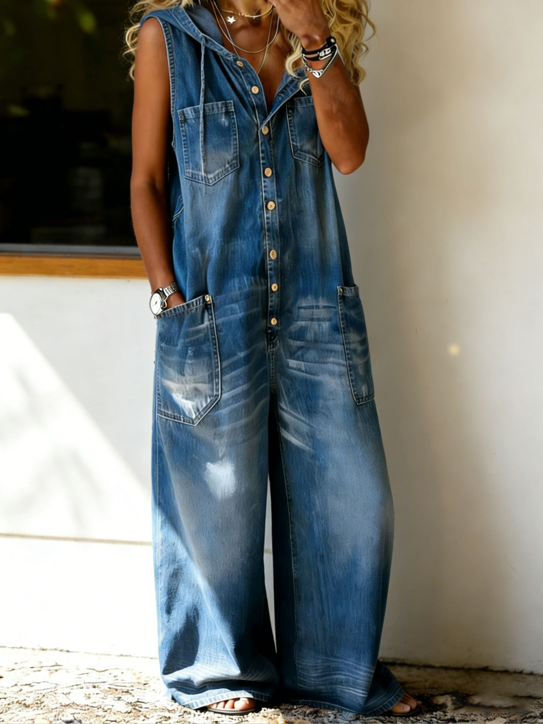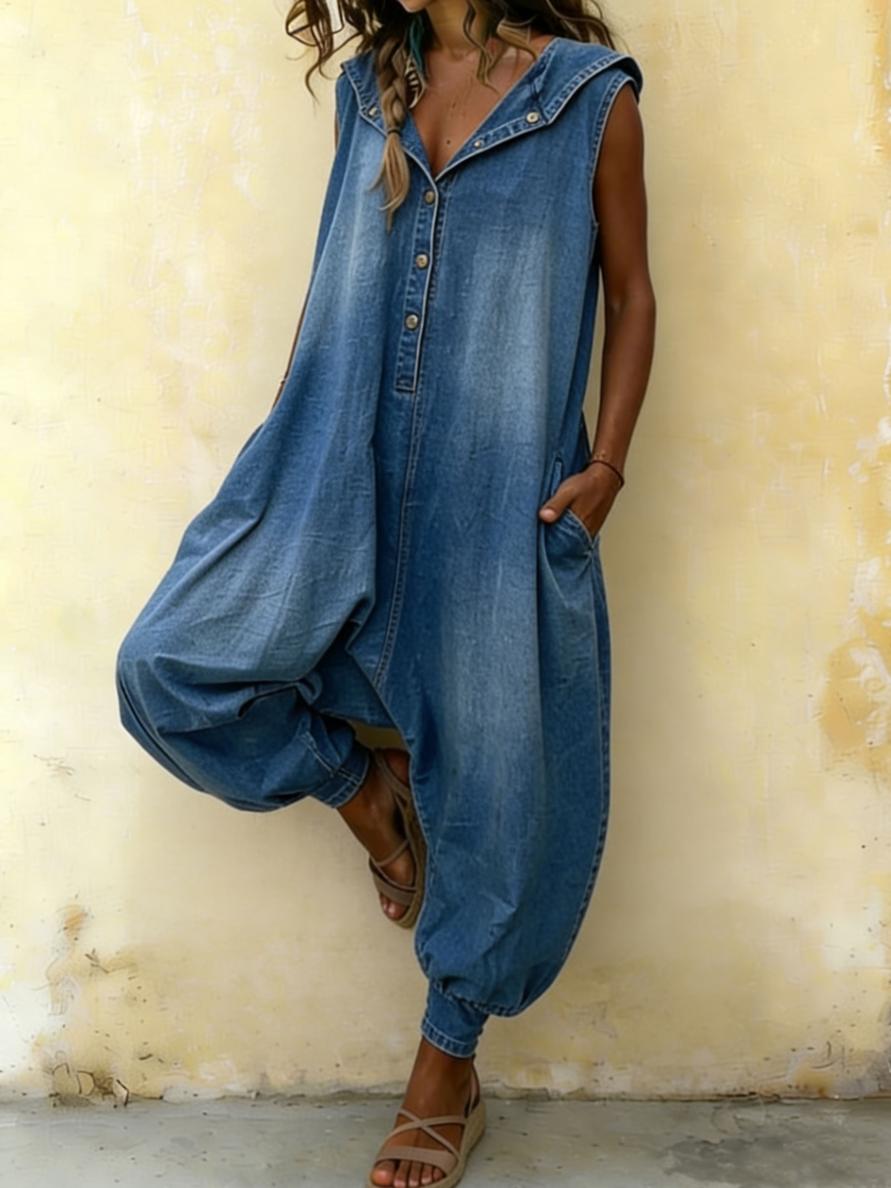 Women’s Casual Sleeveless Denim Hoodie Jumpsuit