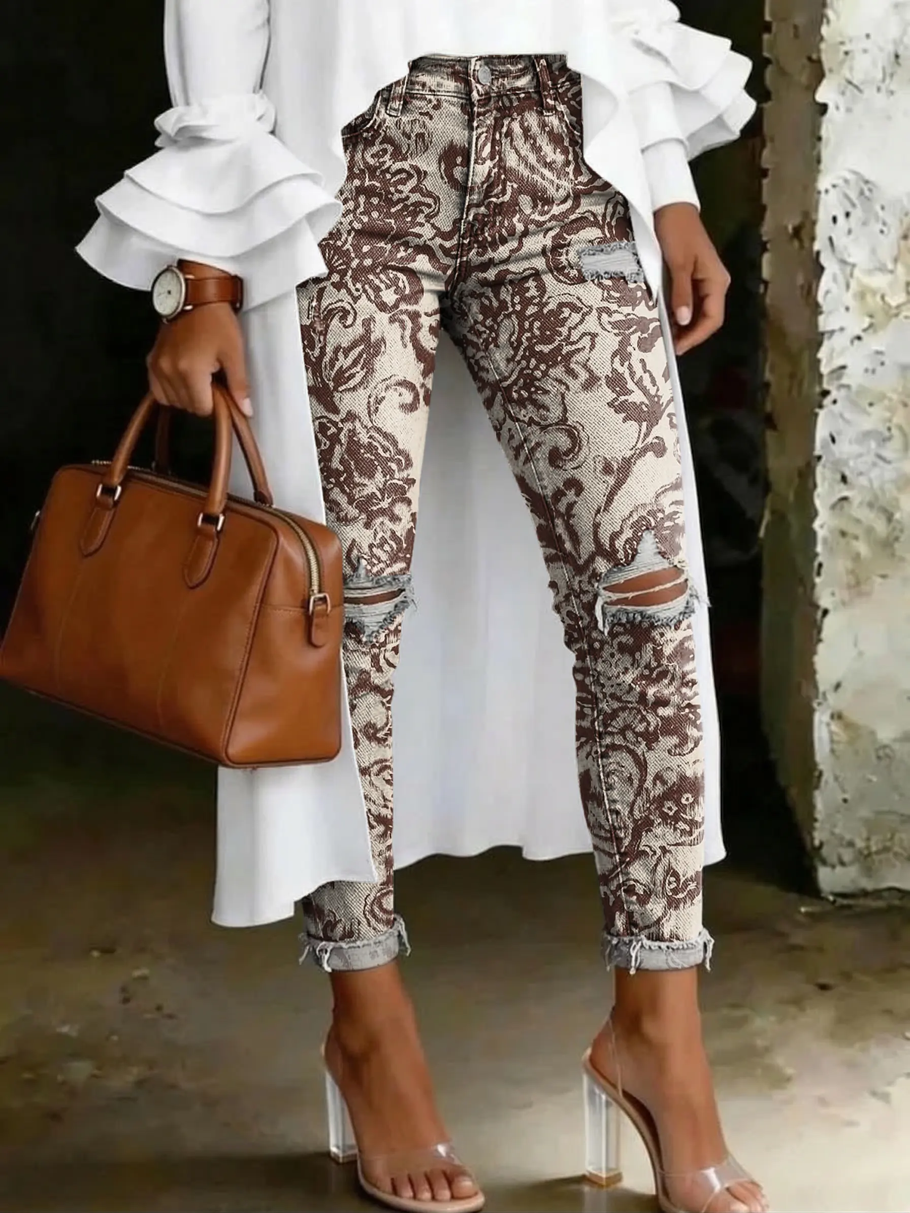Women's Fashion Casual Retro Floral Print Ripped Skinny Jeans