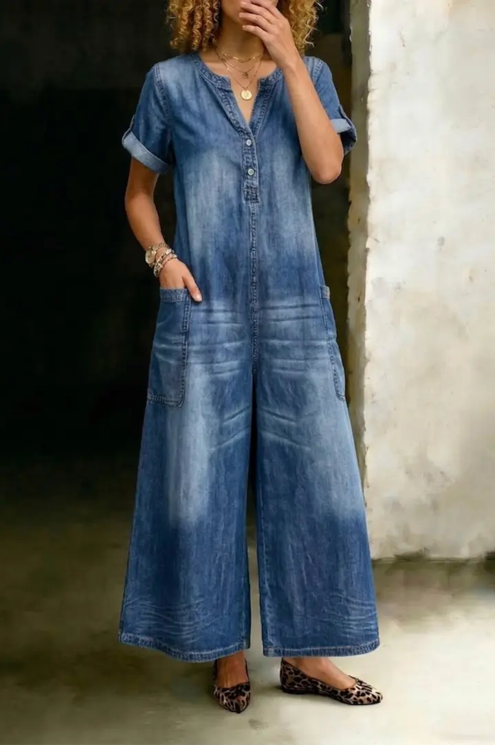 Women's Casual Short Sleeve Denim Jumpsuit - Retro V-neck Button Down Wide Leg Romper With Pockets