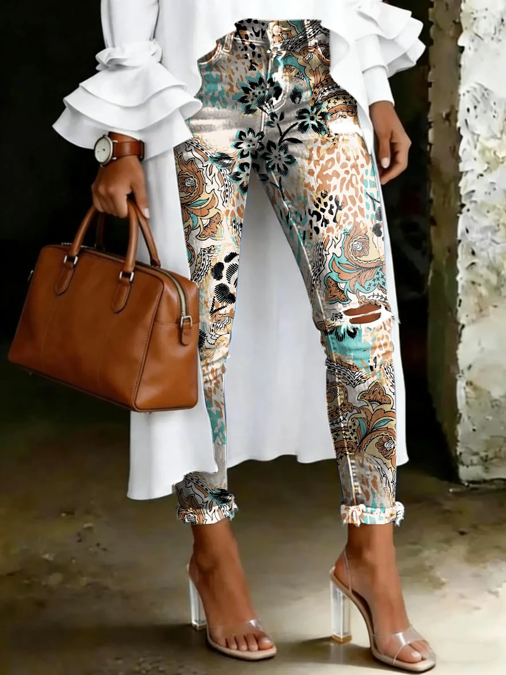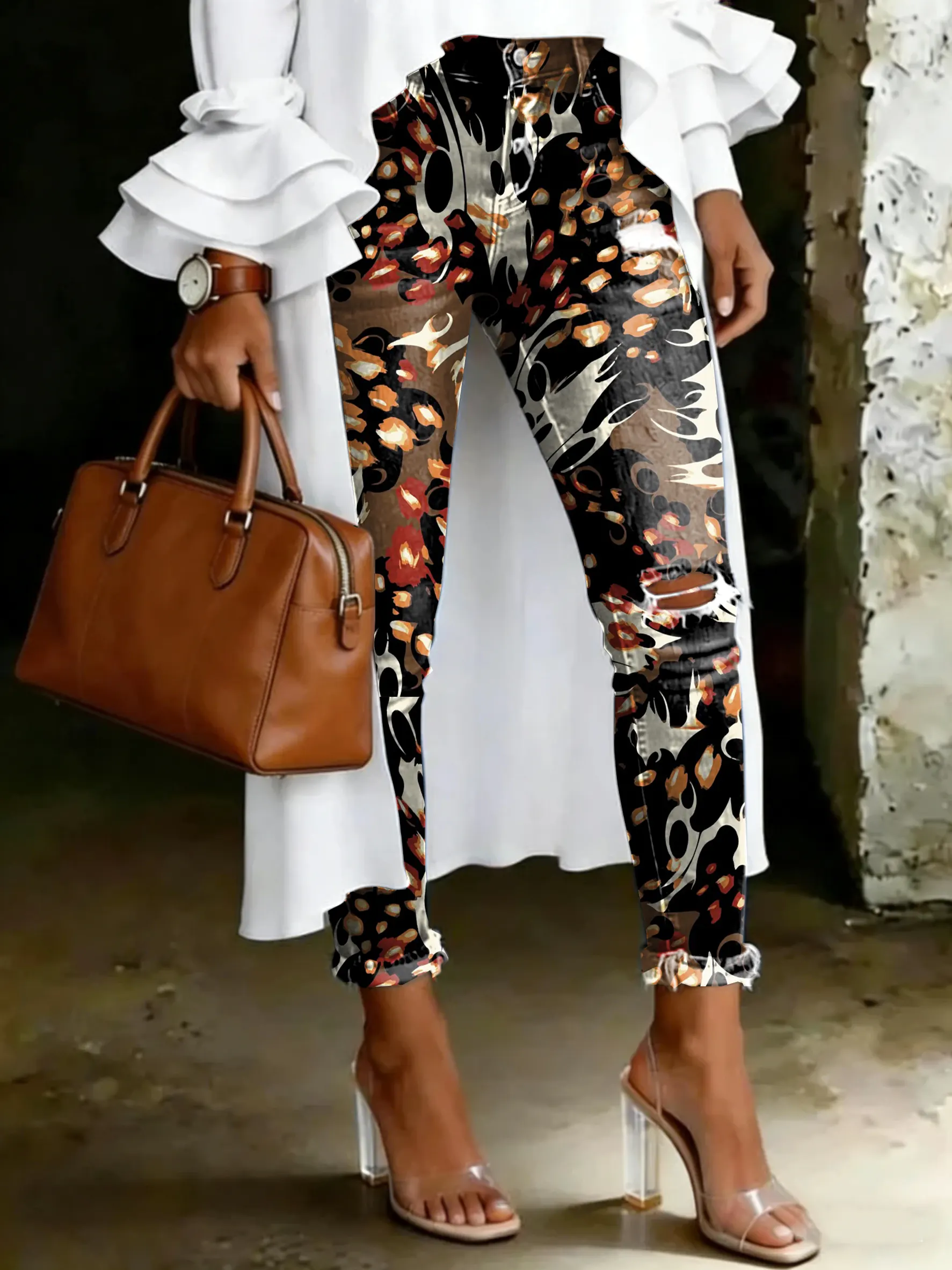 Women's Vintage Multicolor Leopard Floral Print Casual High-waisted Ripped Skinny Jeans