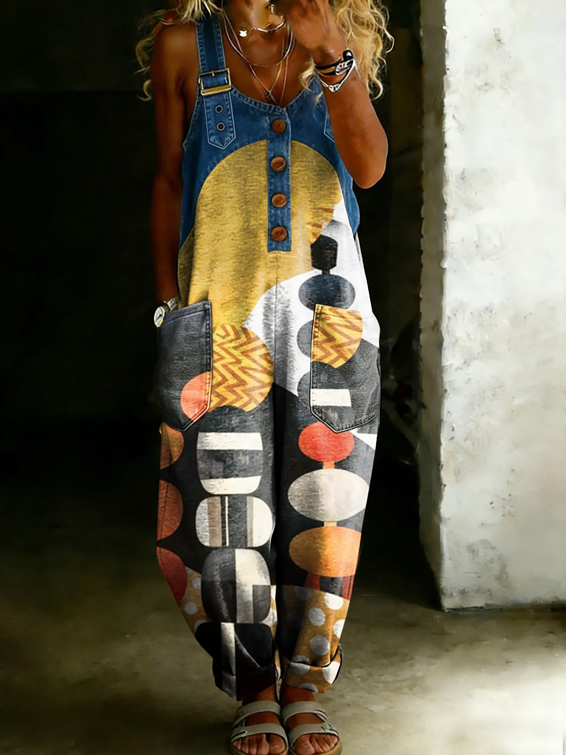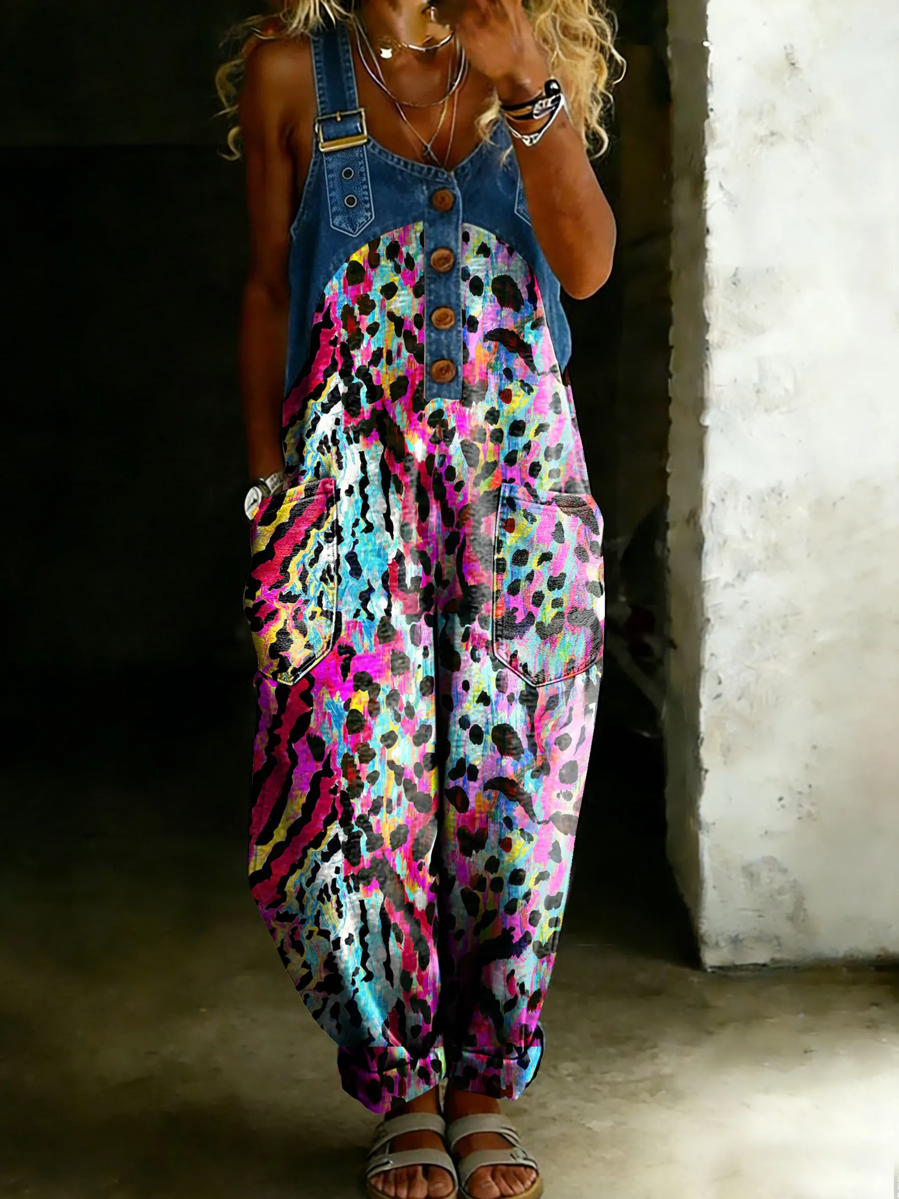 Women’s Vintage Multicolor Leopard Totem Art Casual One Piece Denim Patchwork Jumpsuit
