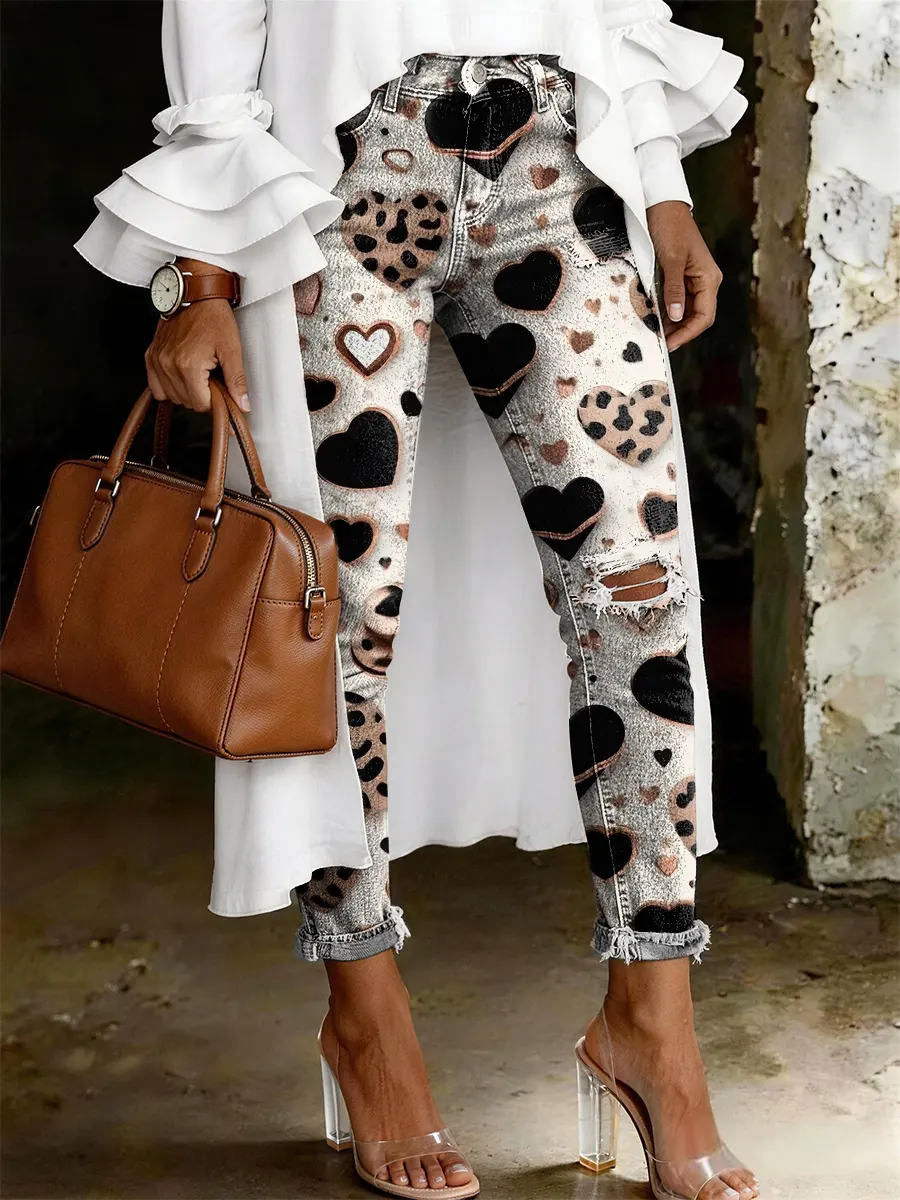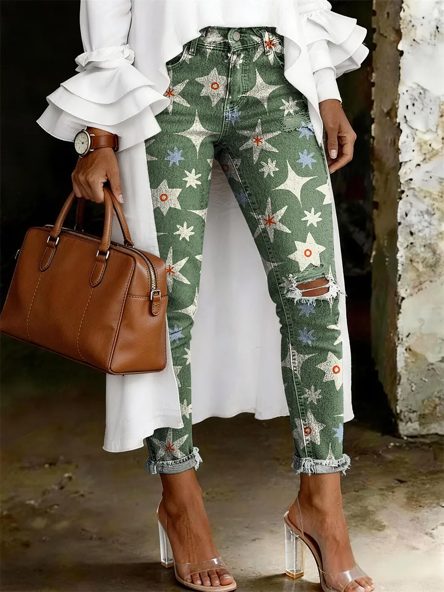 Women's Fashion Casual Art Print Ripped Skinny Jeans