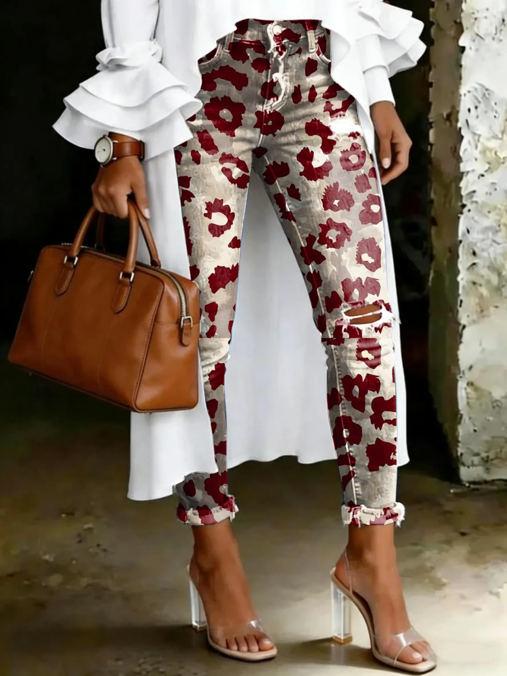 Women's Vintage Leopard Floral Print Casual High-waisted Ripped Skinny Jeans