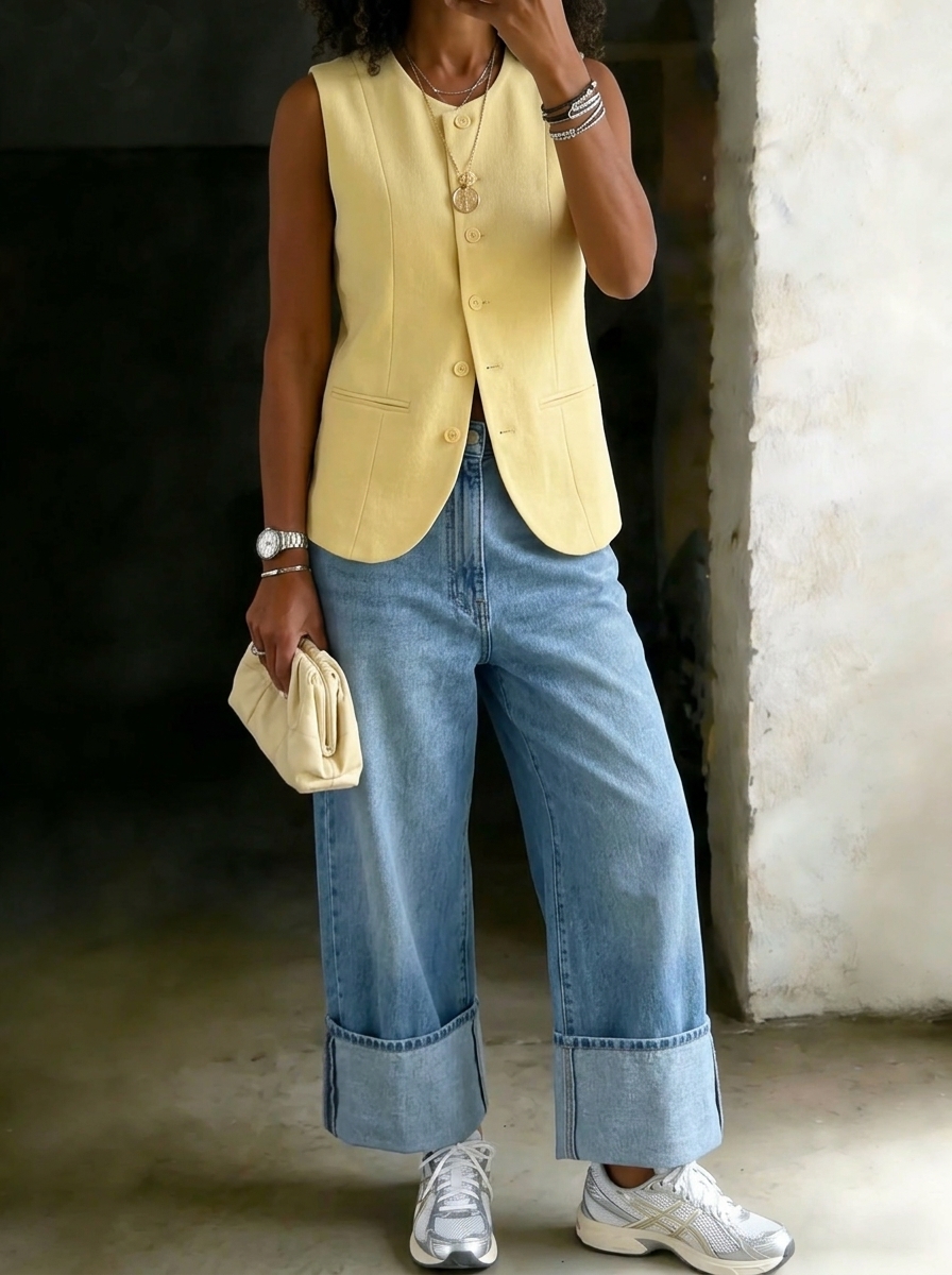 Women's Sleeveless Button-front V-neck Vest & Wide-leg Jeans Set
