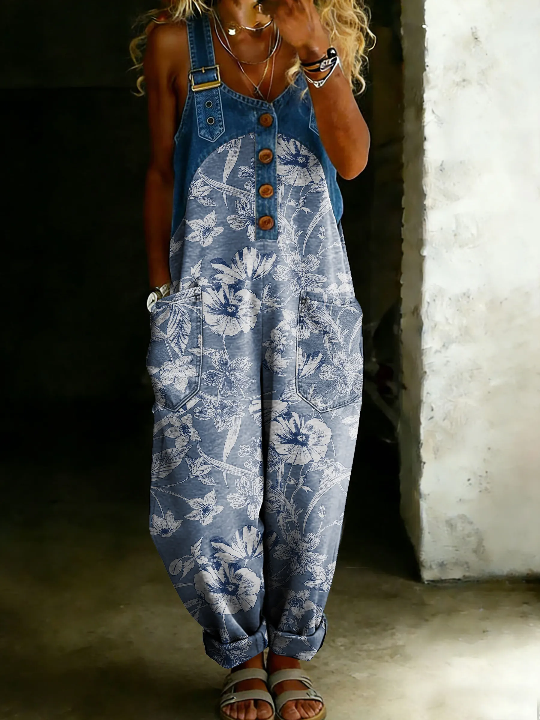 Women’s Vintage Floral Art Casual One Piece Denim Patchwork Jumpsuit