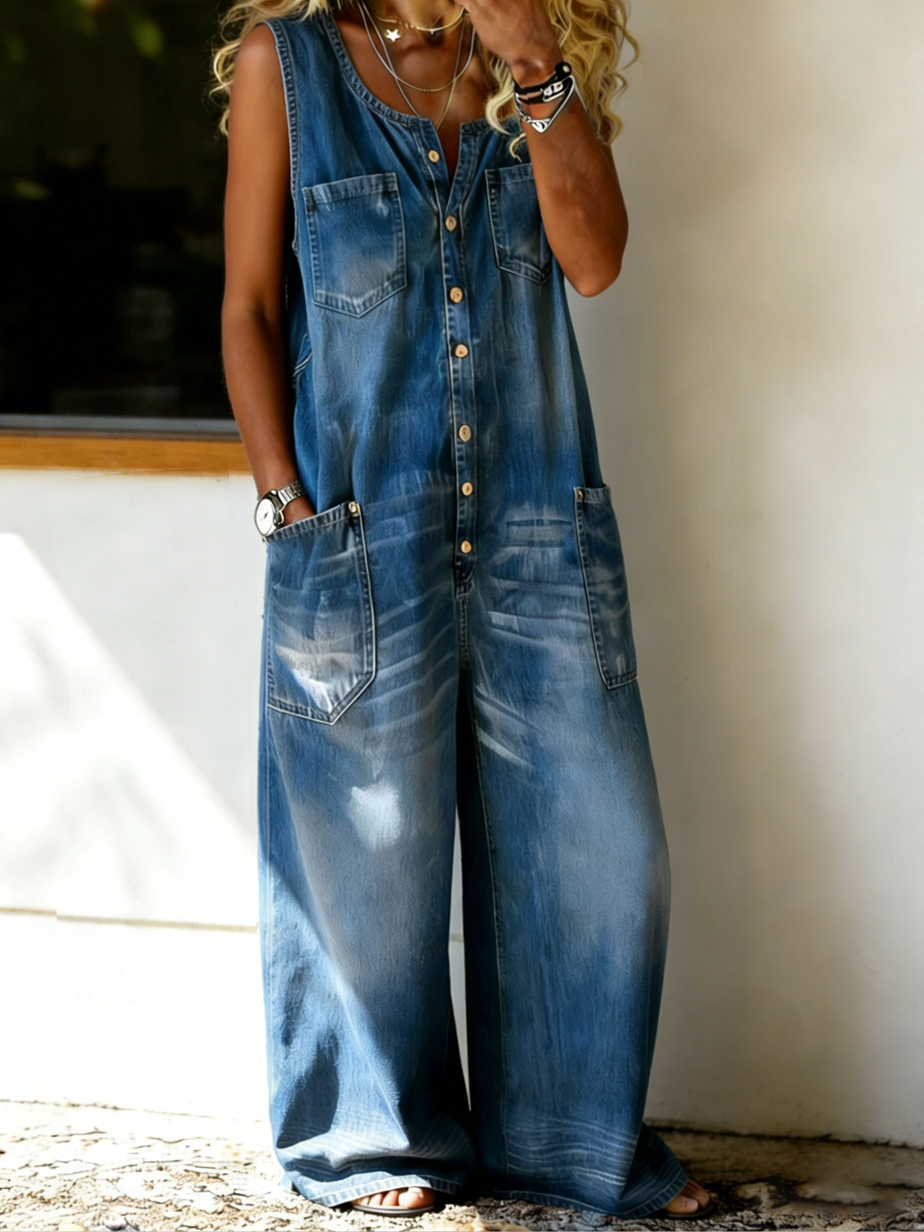 Women's Casual Sleeveless Denim Jumpsuit with Pockets