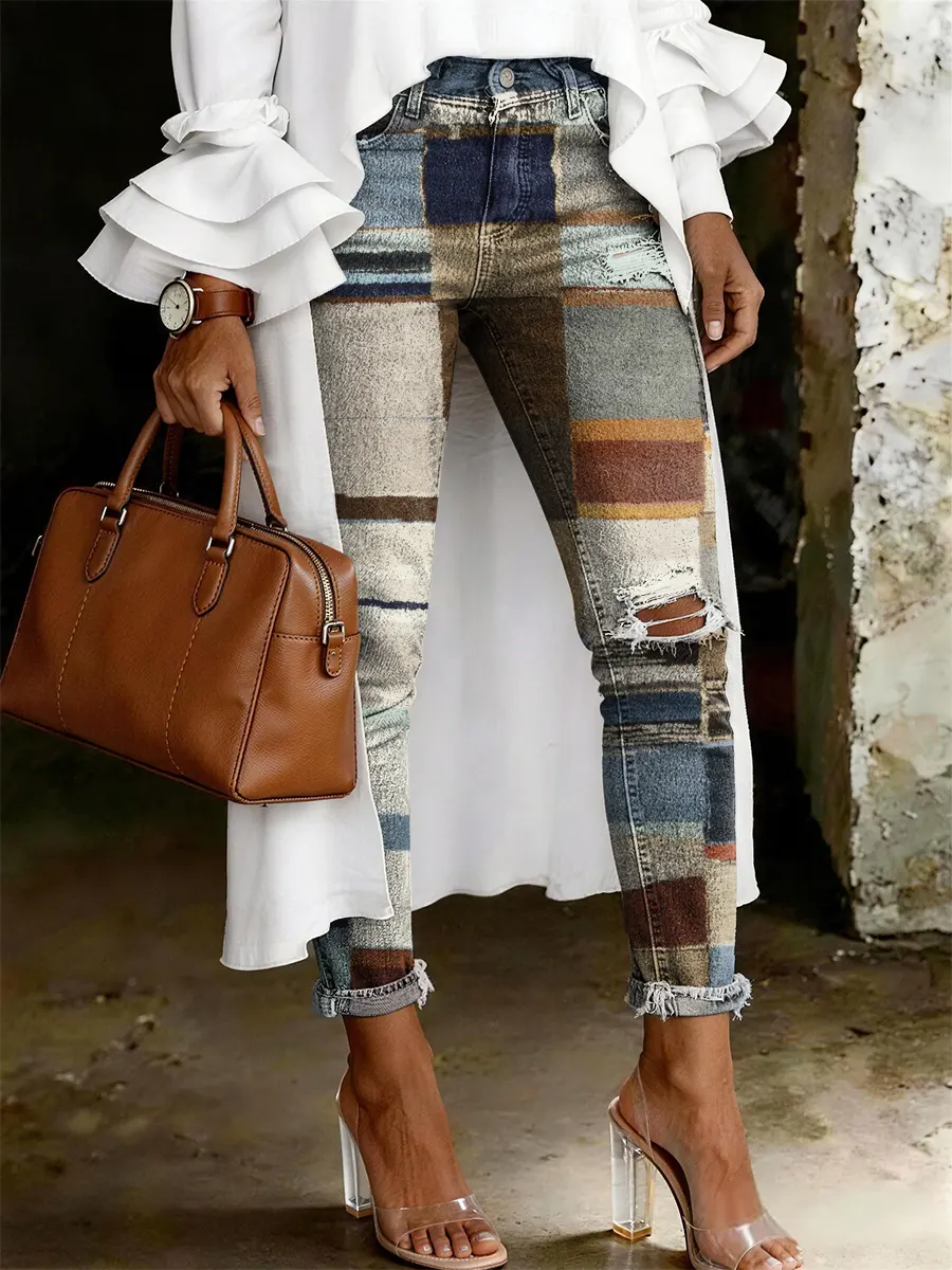 Retro Checkered Artistic Print Casual Ripped Skinny Jeans