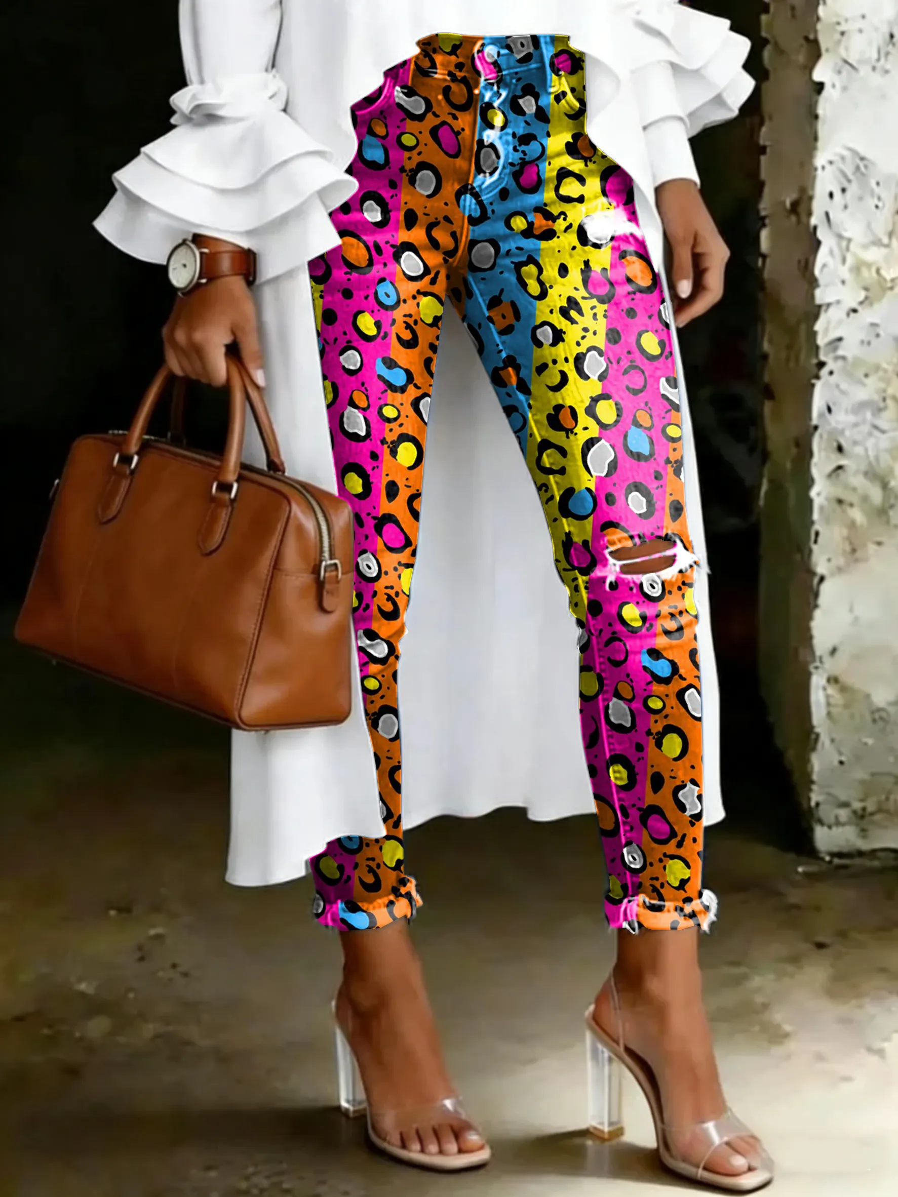 Women's Vintage Multicolor Leopard Print Casual High-waisted Ripped Skinny Jeans