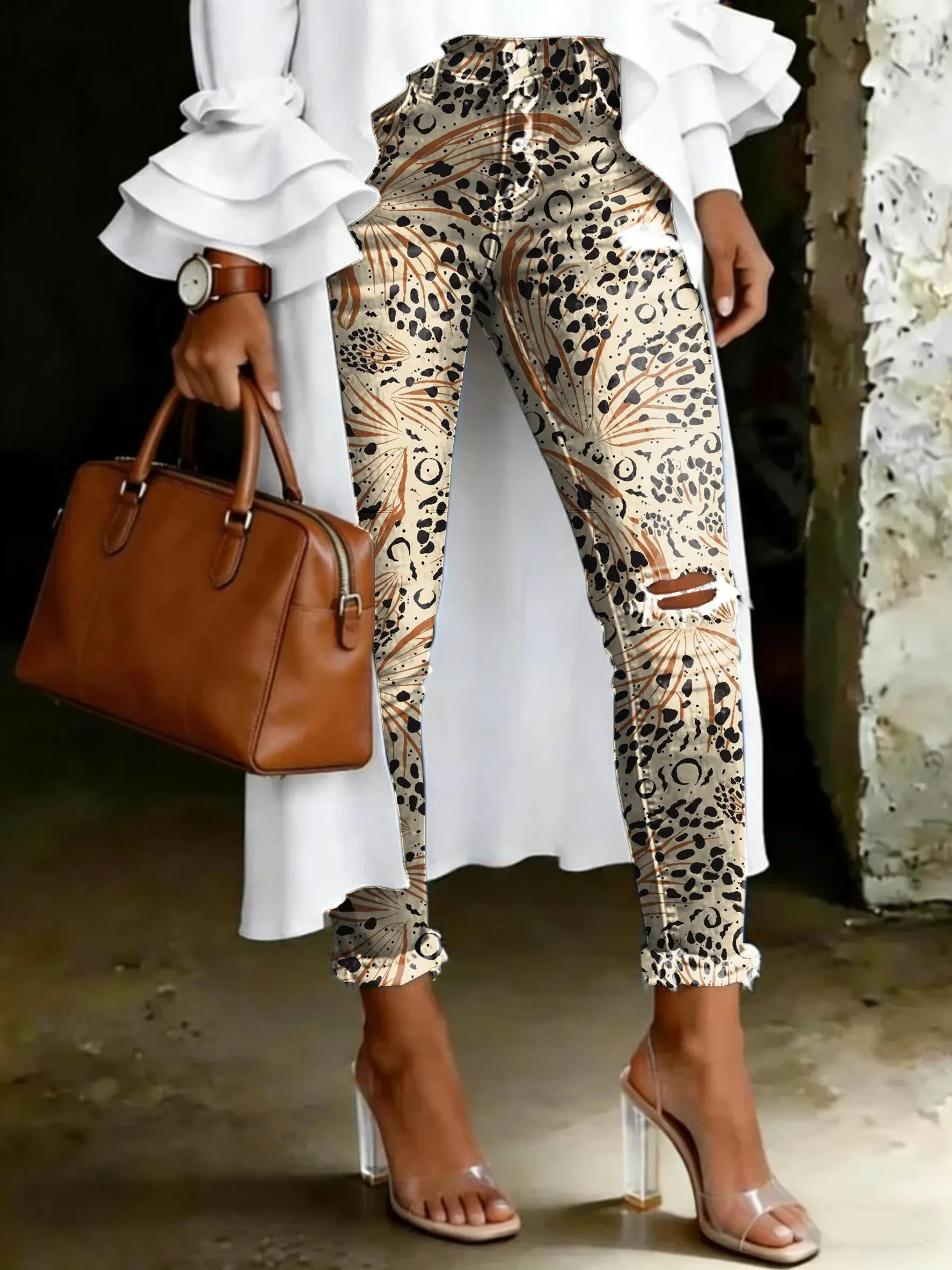 Women's Fashion Casual Leopard Print Ripped Skinny Jeans