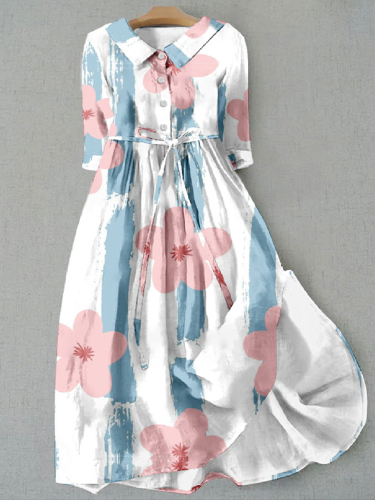 Floral Print Waist Tie-Up Lapel Casual Midi Dress