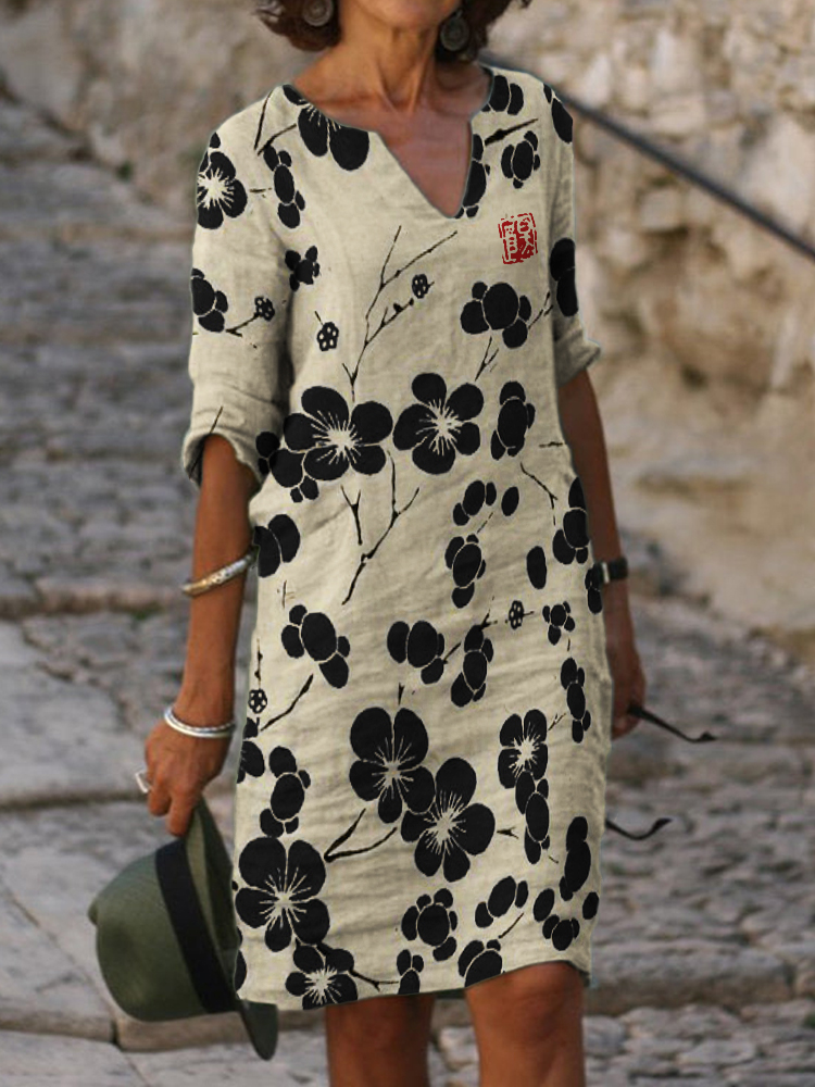Art Floral Loose Round Neck Medium Length Dress