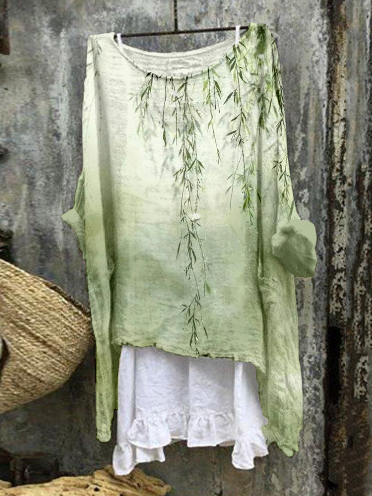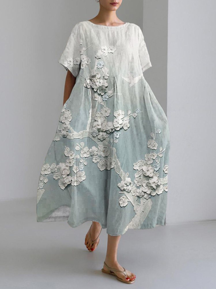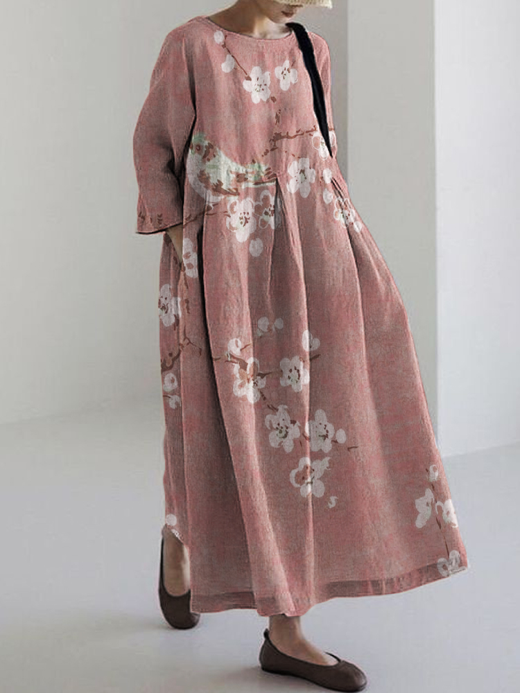 Women's Loose Blossom Printed Cotton Linen Crew Neck Maxi Dress