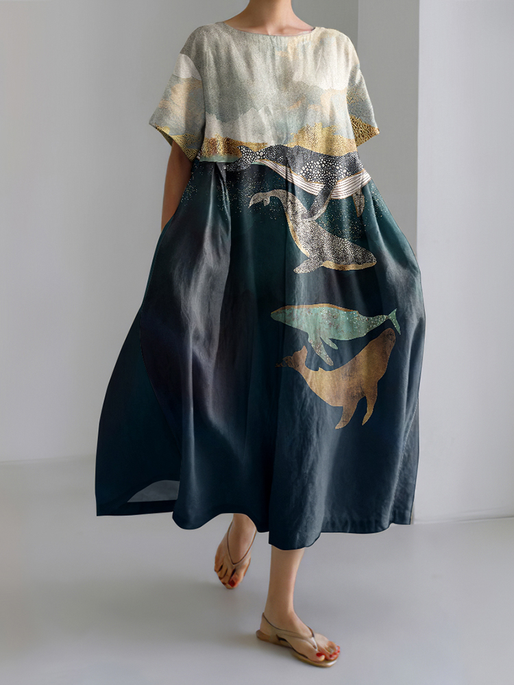 Whale Print Crew Neck Short Sleeved Midi Dress