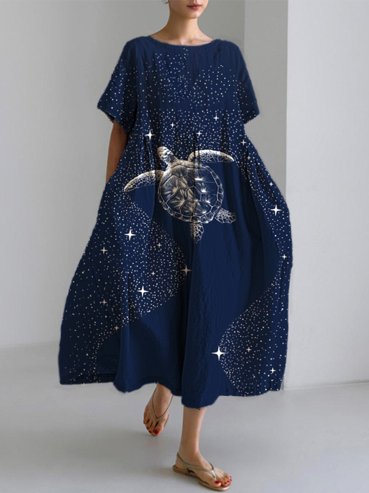 Vintage Japanese Art Print Short Sleeve Loose Midi Dress