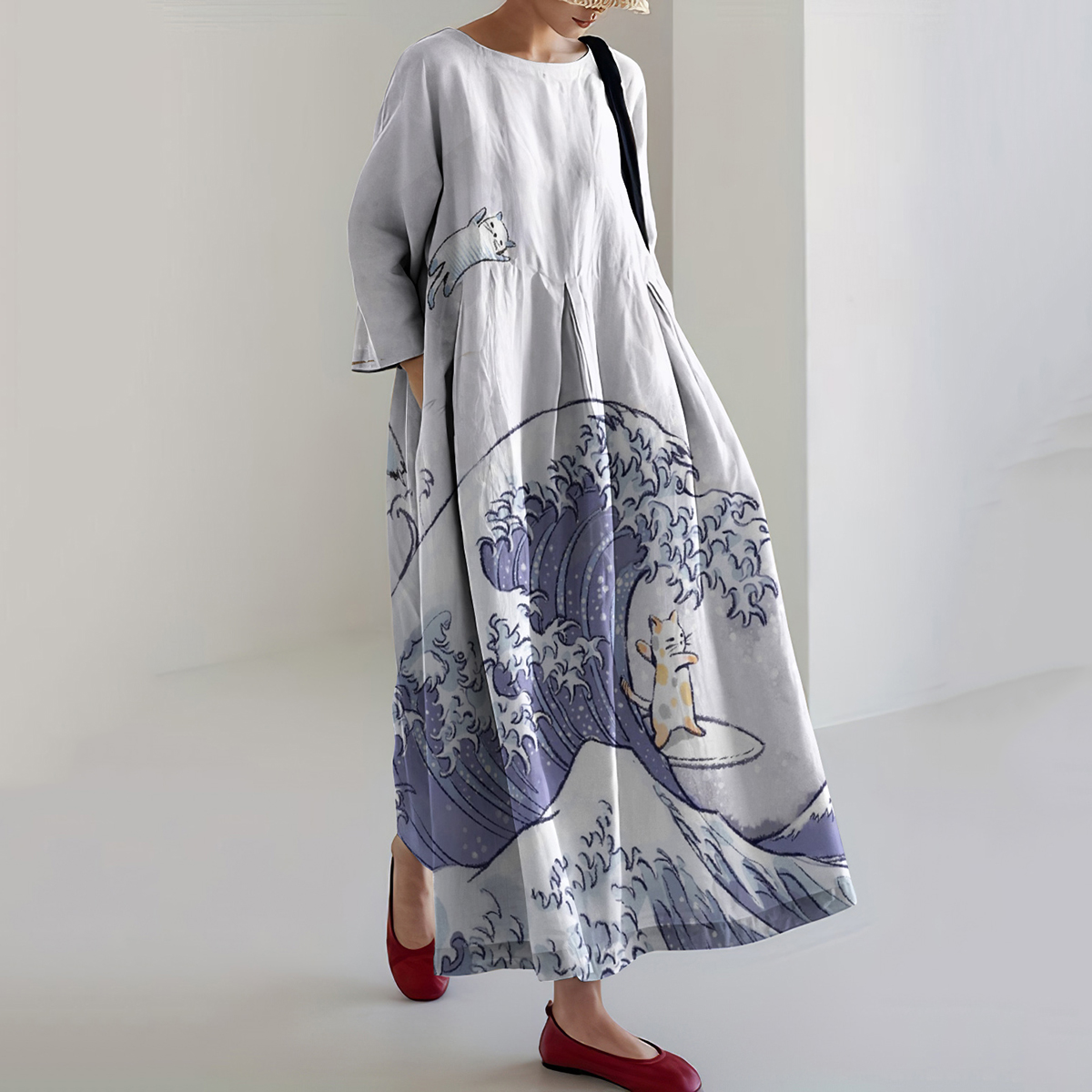 Cozy Cat Surfing Of The Great Waves Linen Blend Casual Maxi Dress