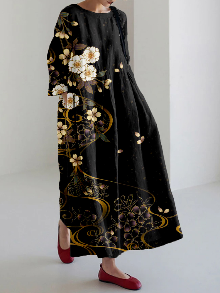 Women Japanese Art Pattern Linen Blend Maxi Dress