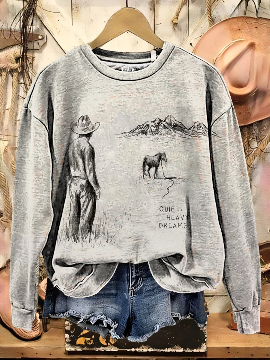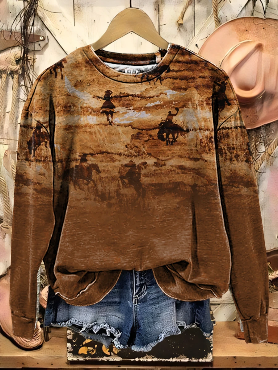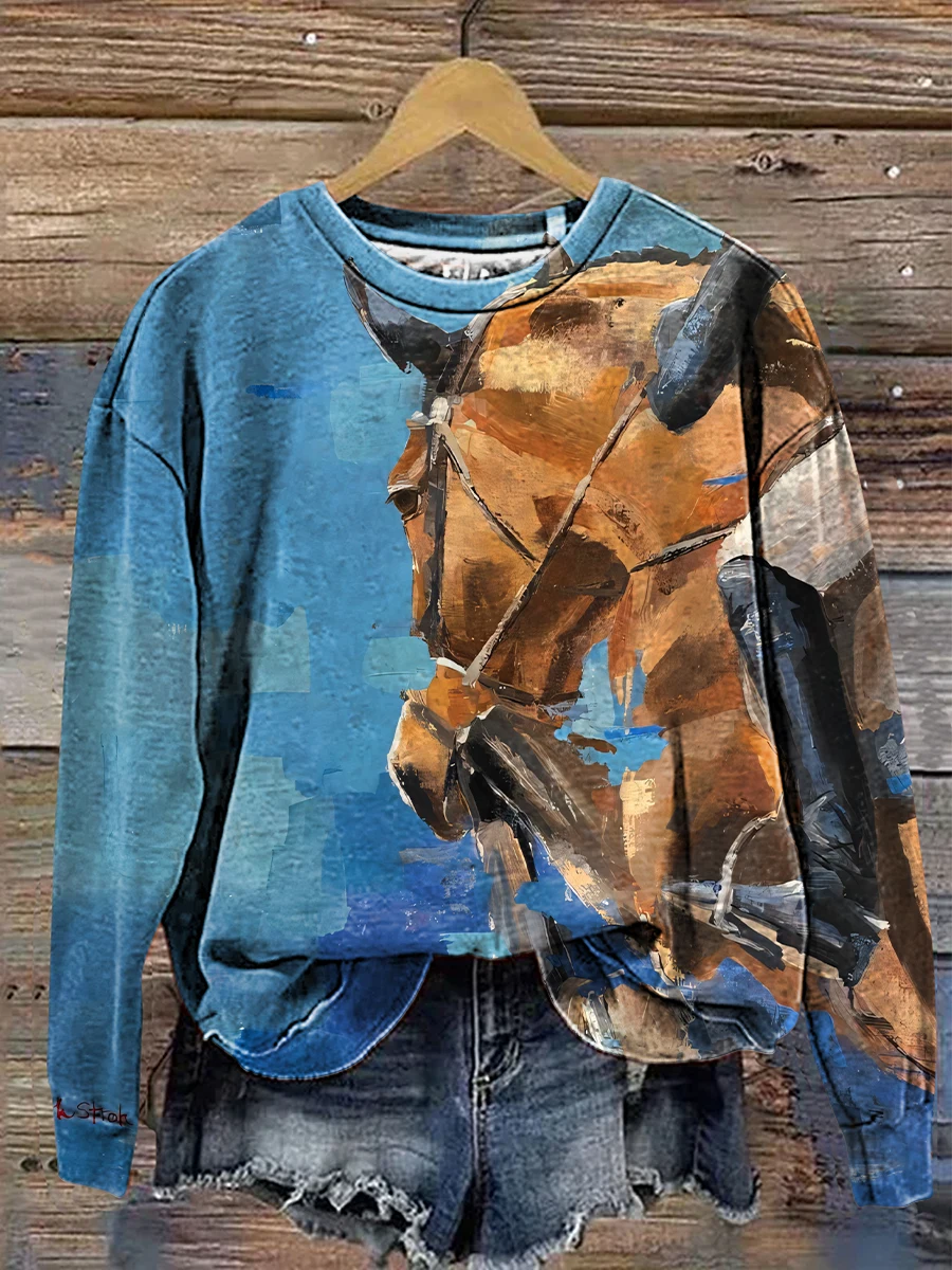 Retro Horse Art Print Casual Cotton Sweatshirt