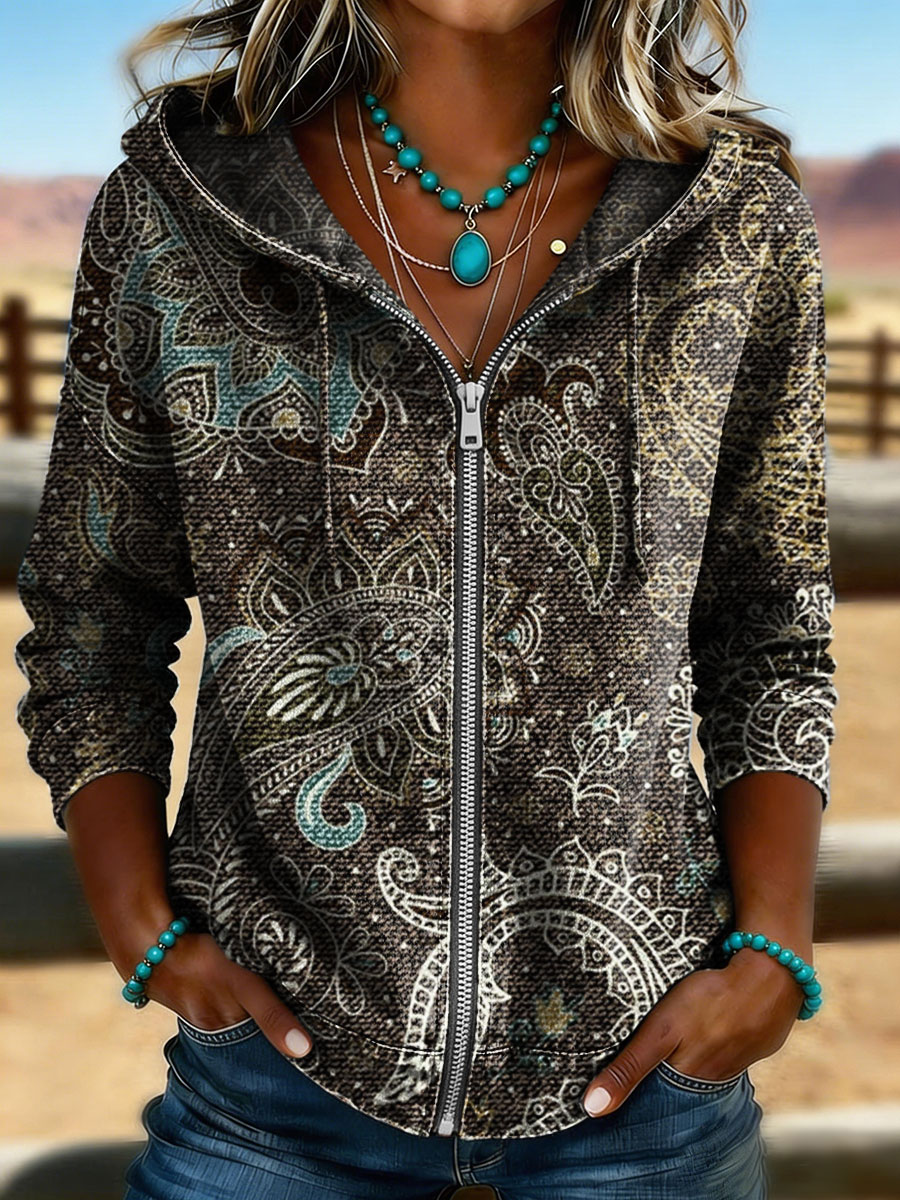 Vintage Paisley Art Print Casual Long Sleeve Denim Zipper Hoodie Coat