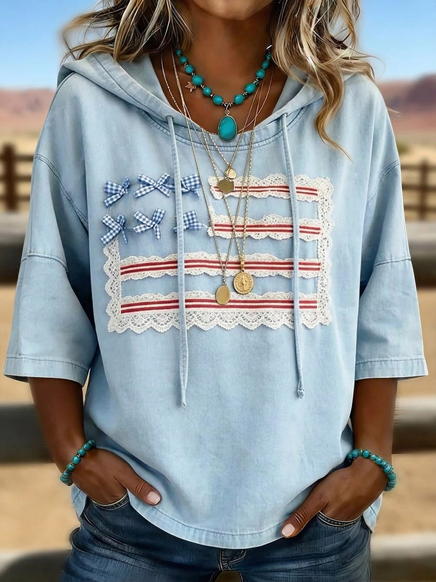 Women's Casual Lace Denim Pocket Hooded Sweatshirt