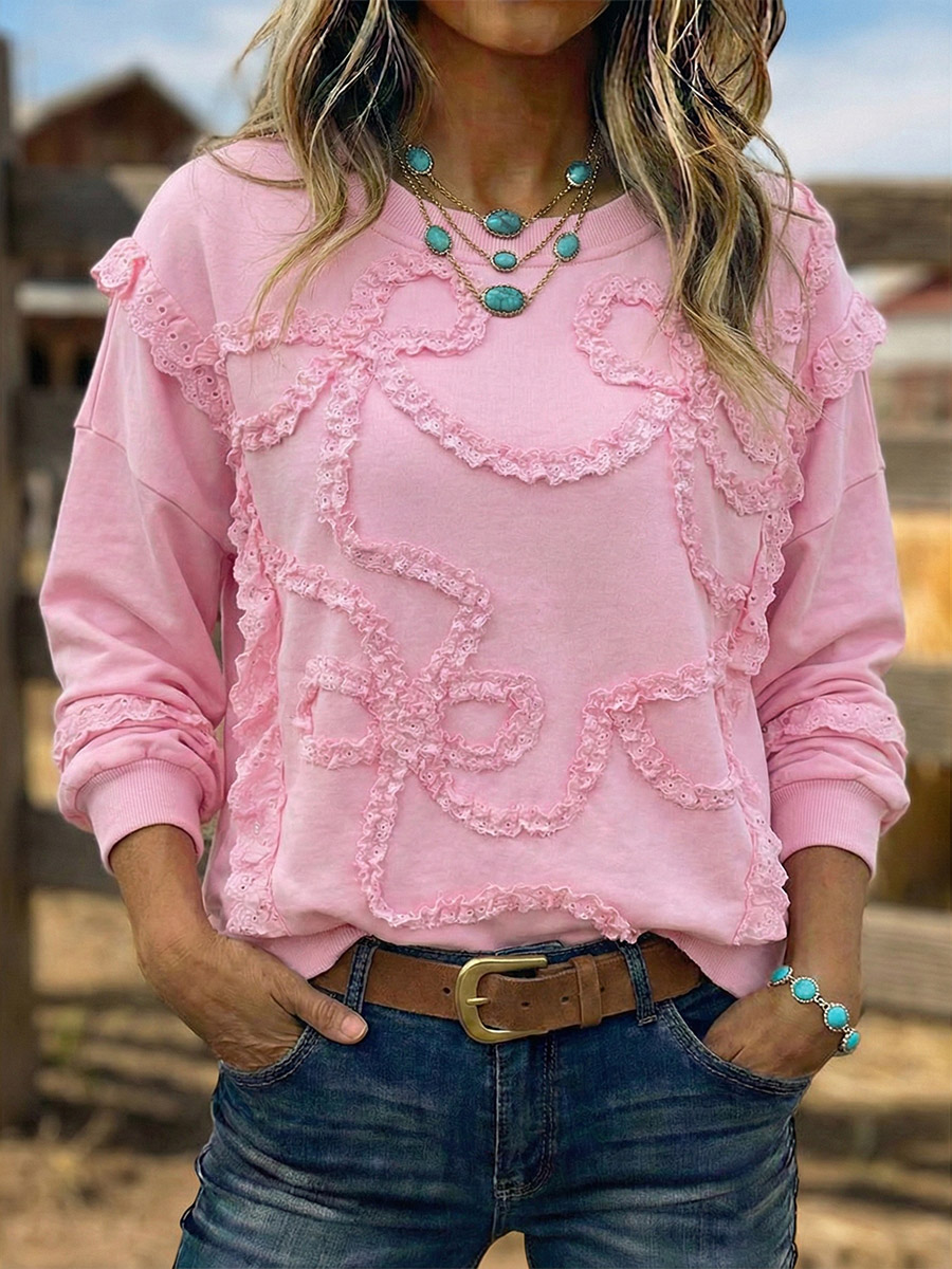 Vintage Western Art Soft Casual Crocheted Flowers Sweatshirt