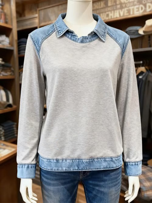 Women'S Casual Lapel Denim Stitching Pullover Sweatshirt