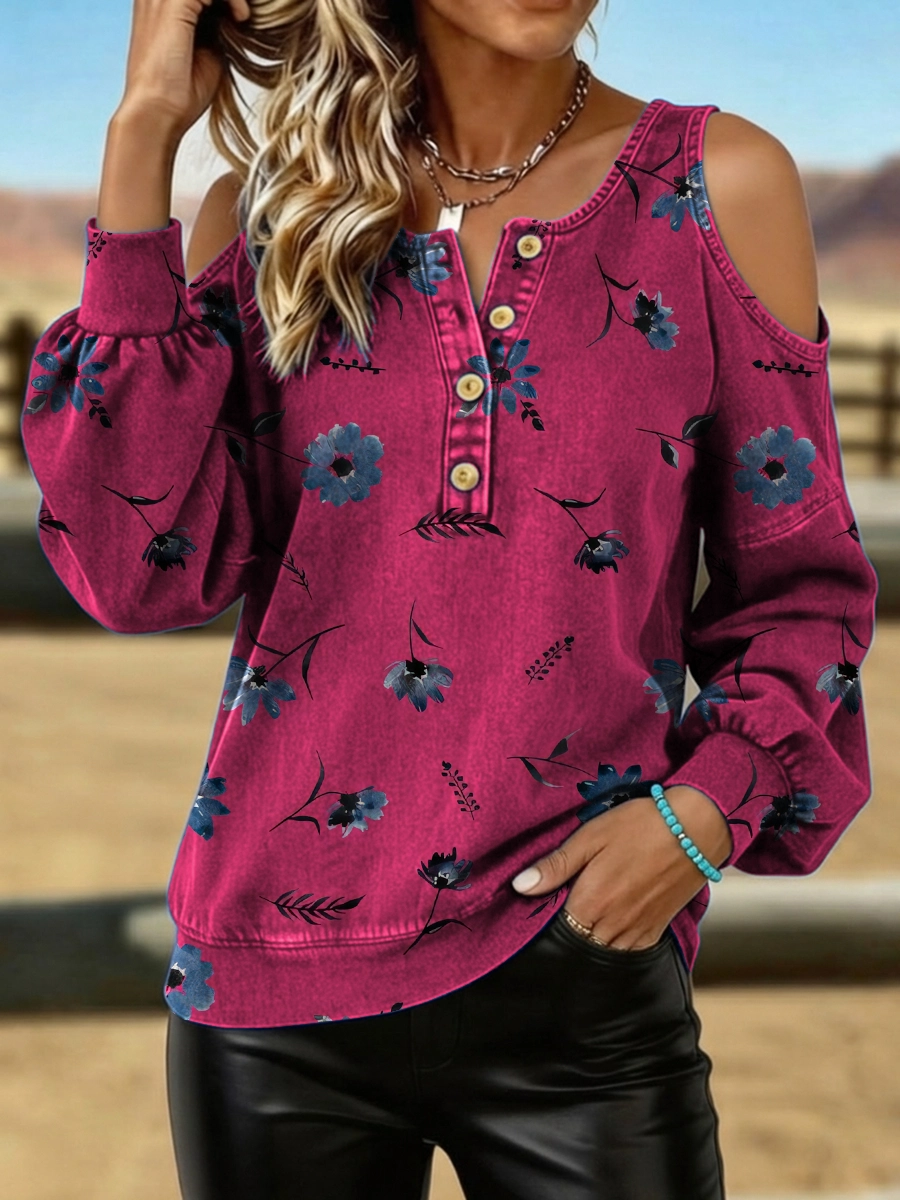 Women's Retro Floral Casual V-neck Off-shoulder Sweatshirt
