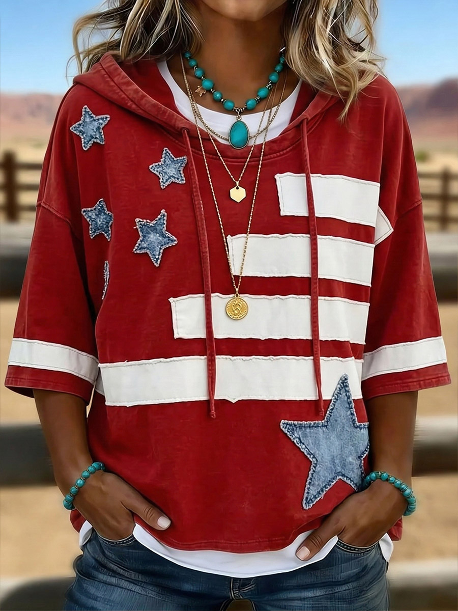 Vintage Art Patchwork Striped Star Casual Hooded Sweatshirt