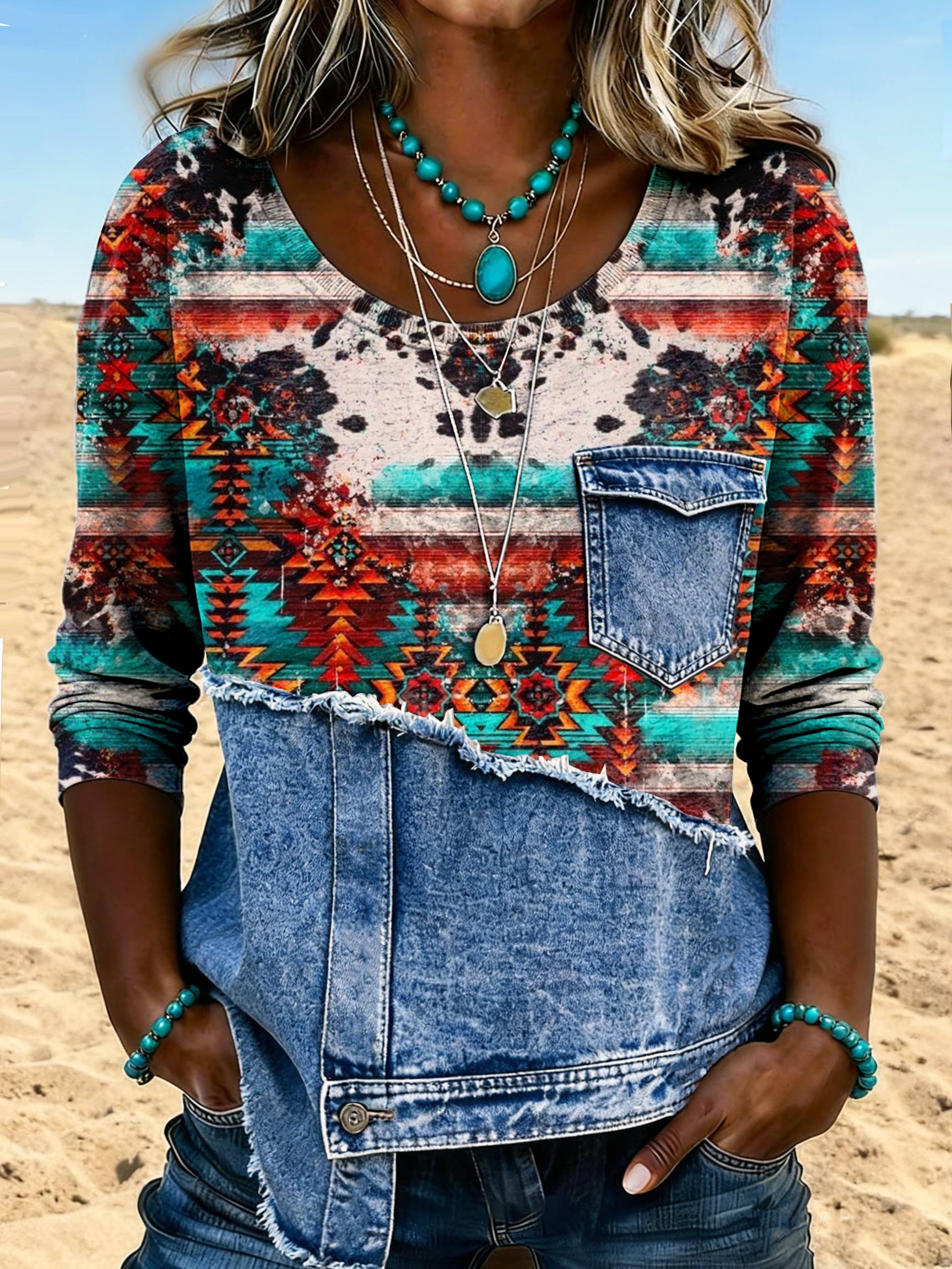 Vintage Contrast Aztec Print Patchwork Denim Print Sweatshirt