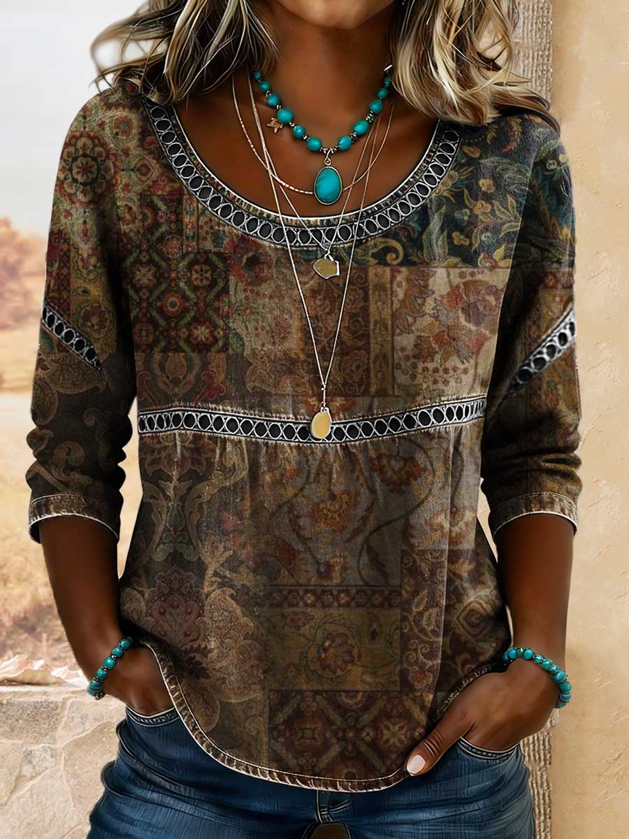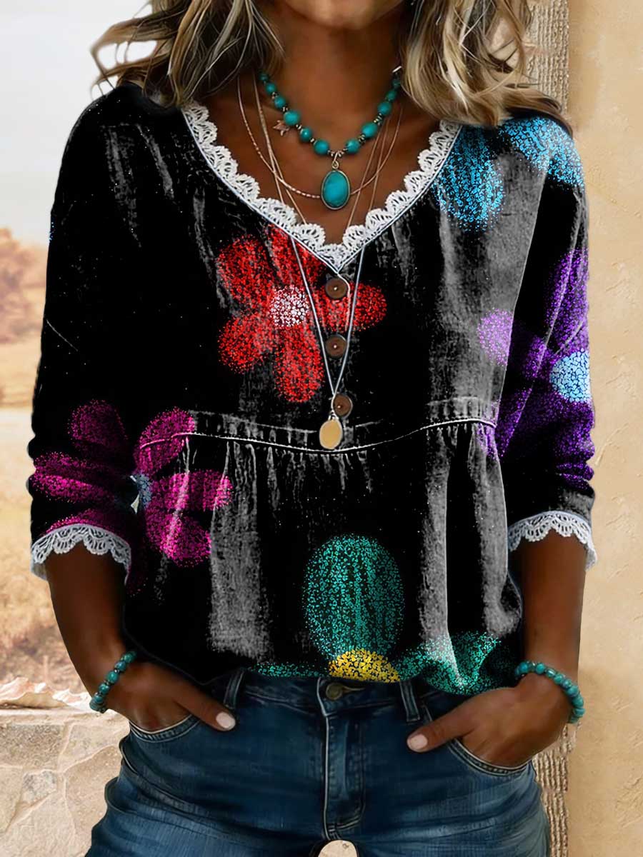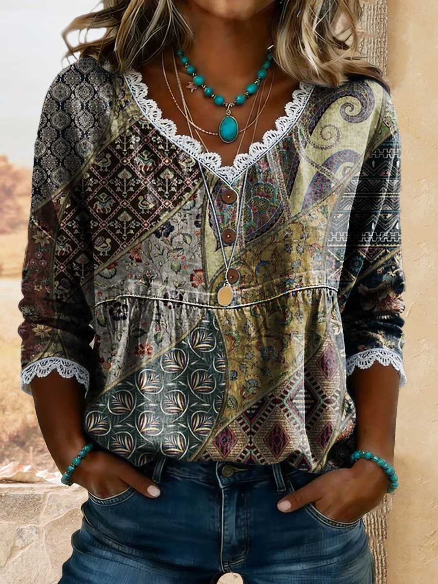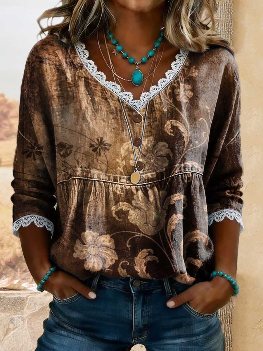 Women's Vintage Floral Pattern Print Casual Long-sleeved V-neck Ruffled And Ruched Cotton Top