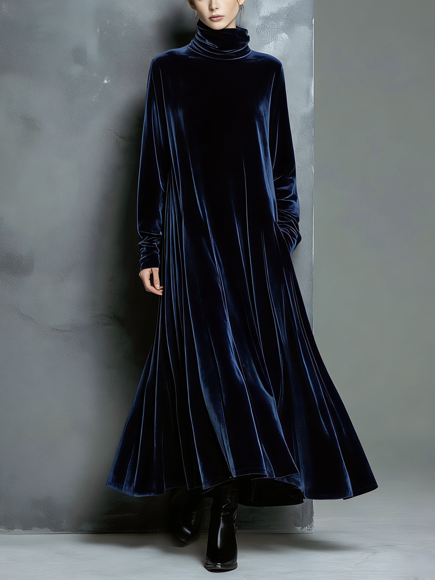 Women's Elegant Navy Blue Velvet High-neck Long-sleeved Loose-fitting Maxi Dress MDZ1680A8AN
