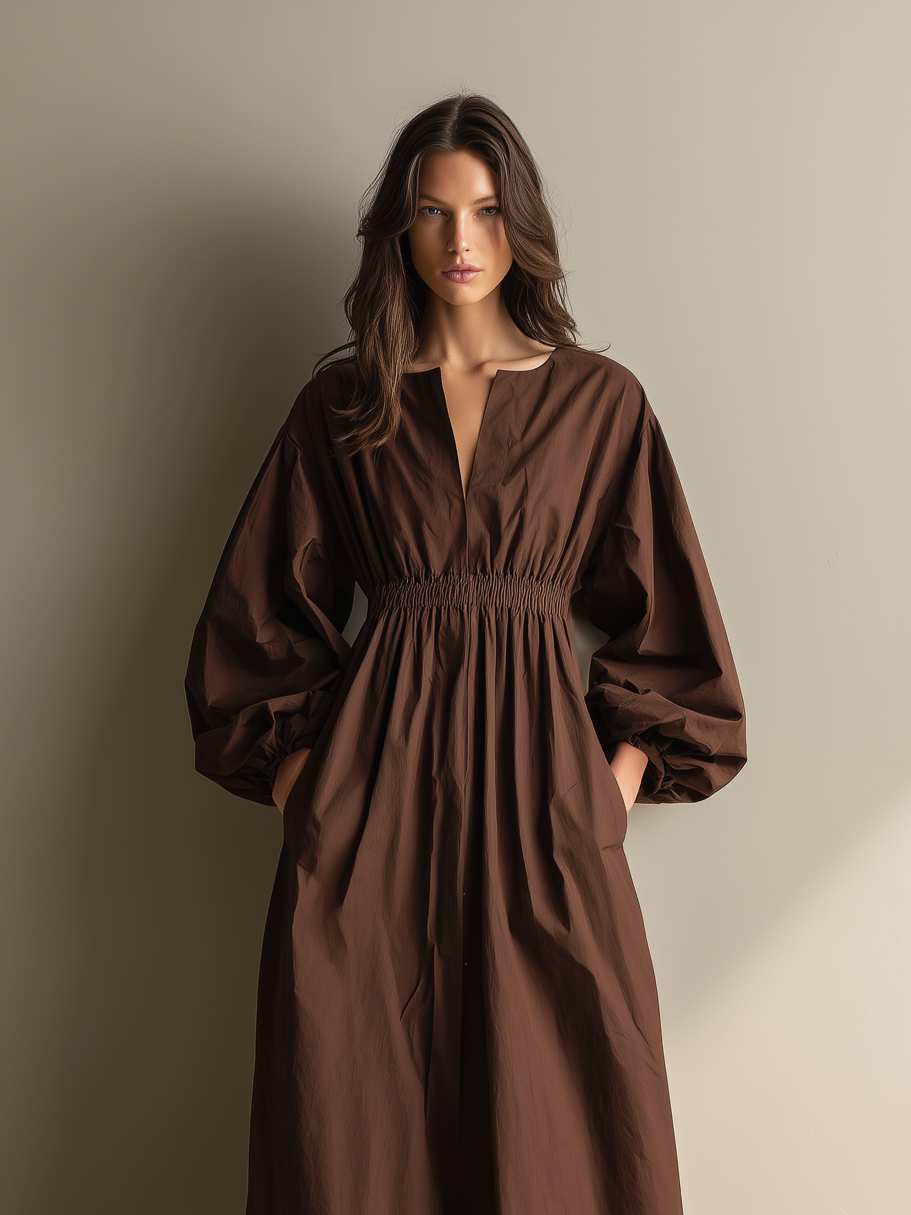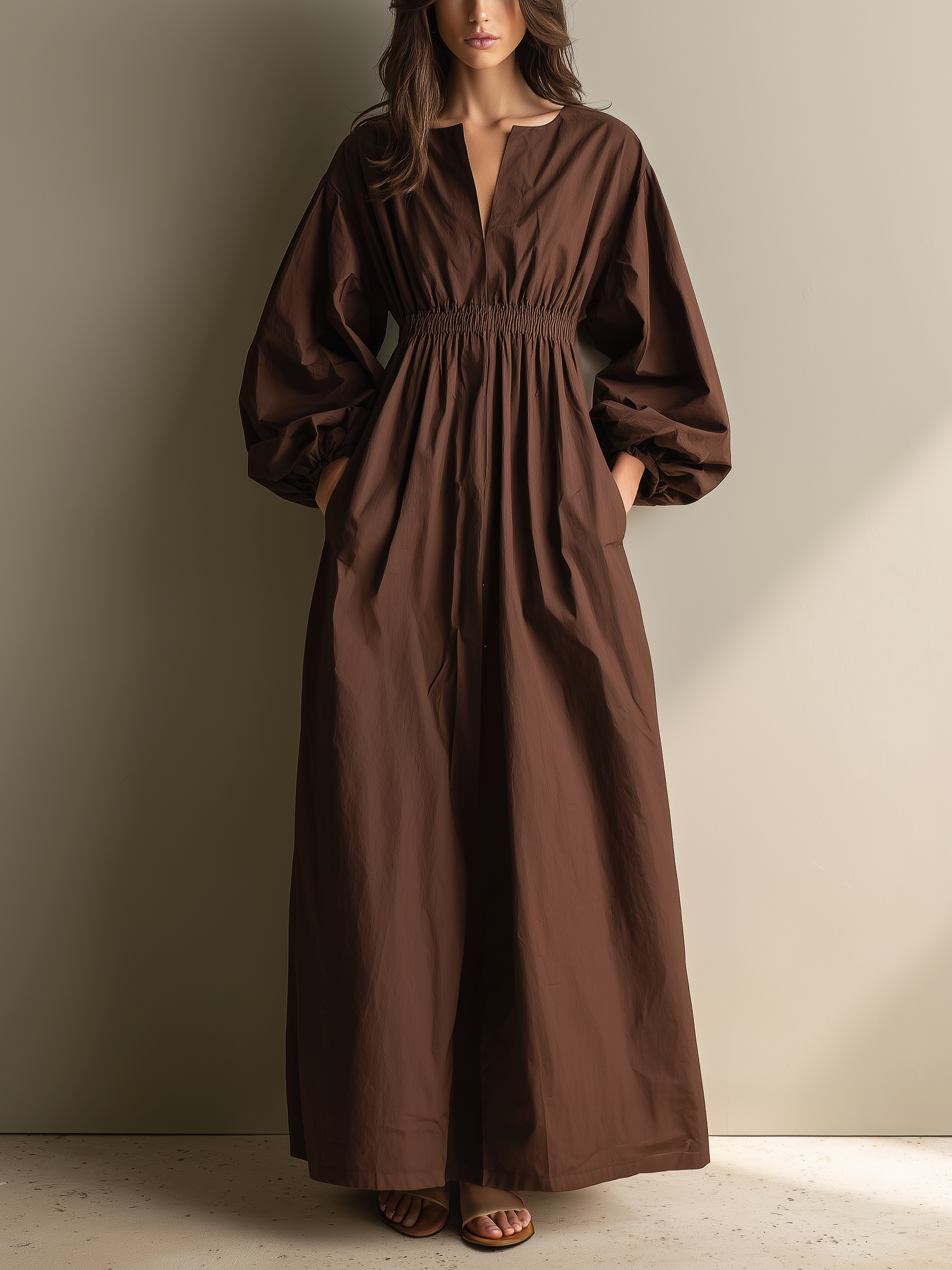 Women's Casual Brown Cotton And Linen V-neck Long-sleeved Maxi Dress With Elastic Waist MDZ1295A0AN