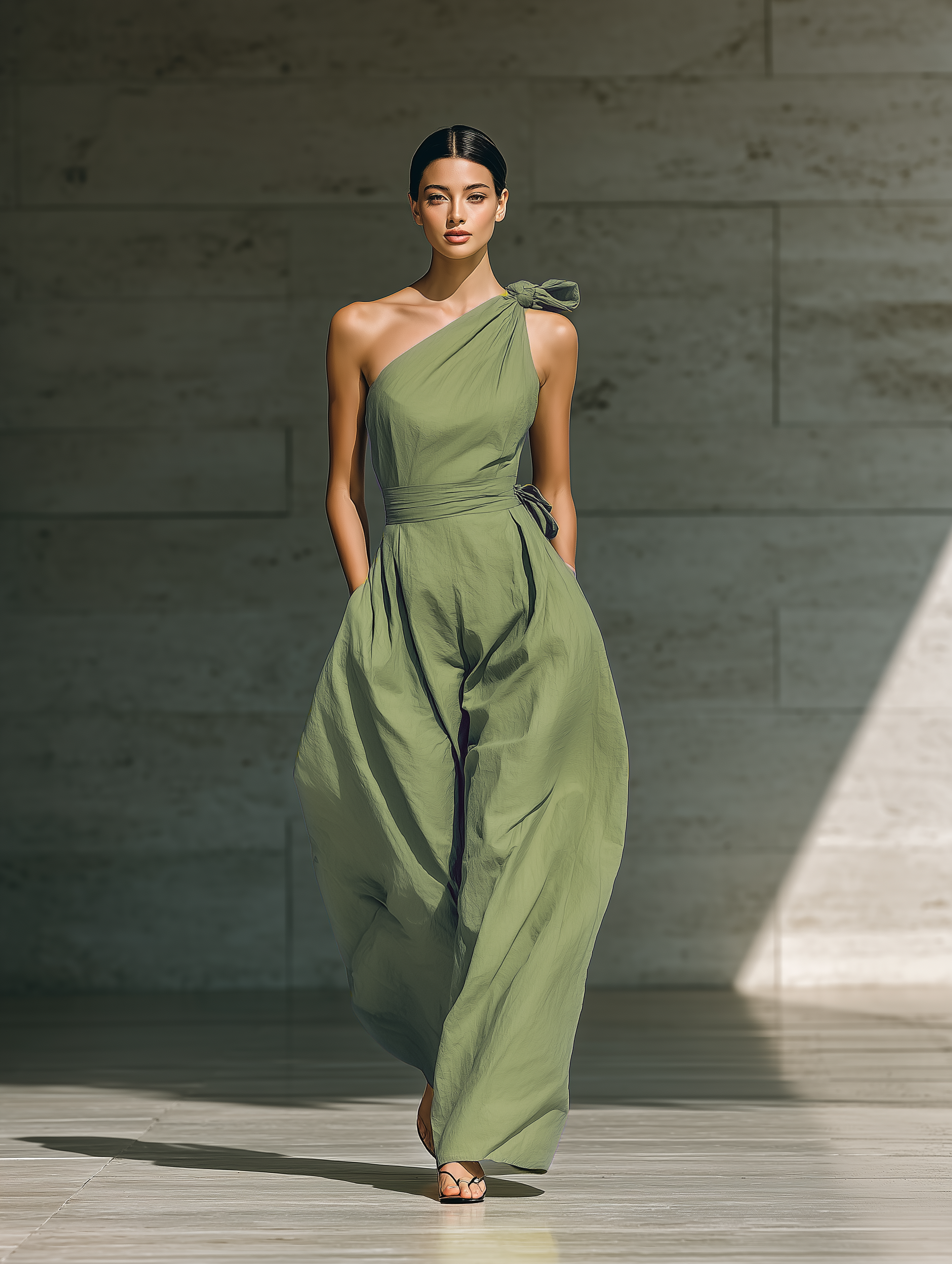 Women's Light Green Cotton And Linen Blend One-Shoulder Wide-Leg Jumpsuit With Tie Waist MDZ3136A8T
