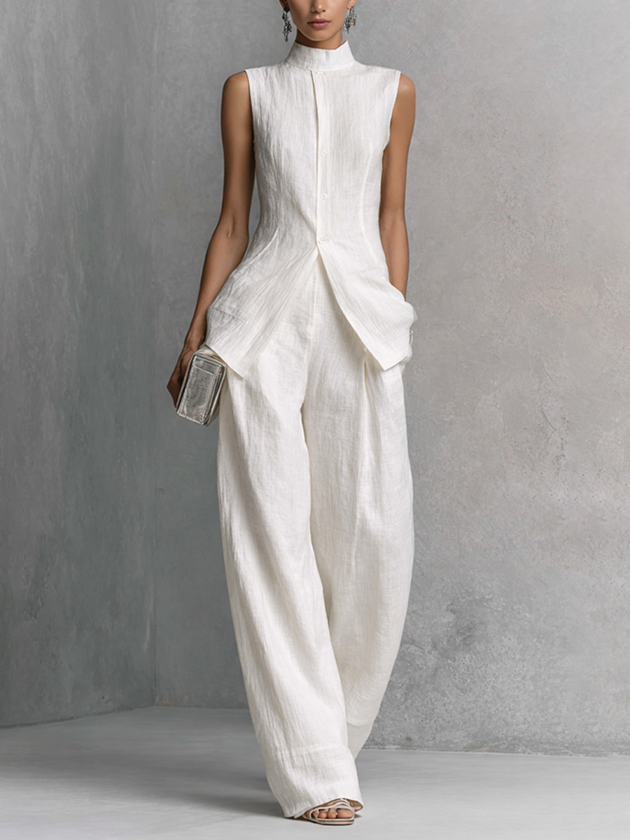 Women's Minimalist Cotton And Linen Blend Sleeveless Blouse And Wide-leg Pants Set MDZ0873A5Y