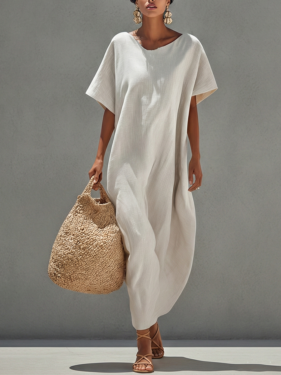 Women's Minimalist Linen Blend Off-the-shoulder Batwing Sleeve Straight-cut Maxi Dress MDZ0949A8Y