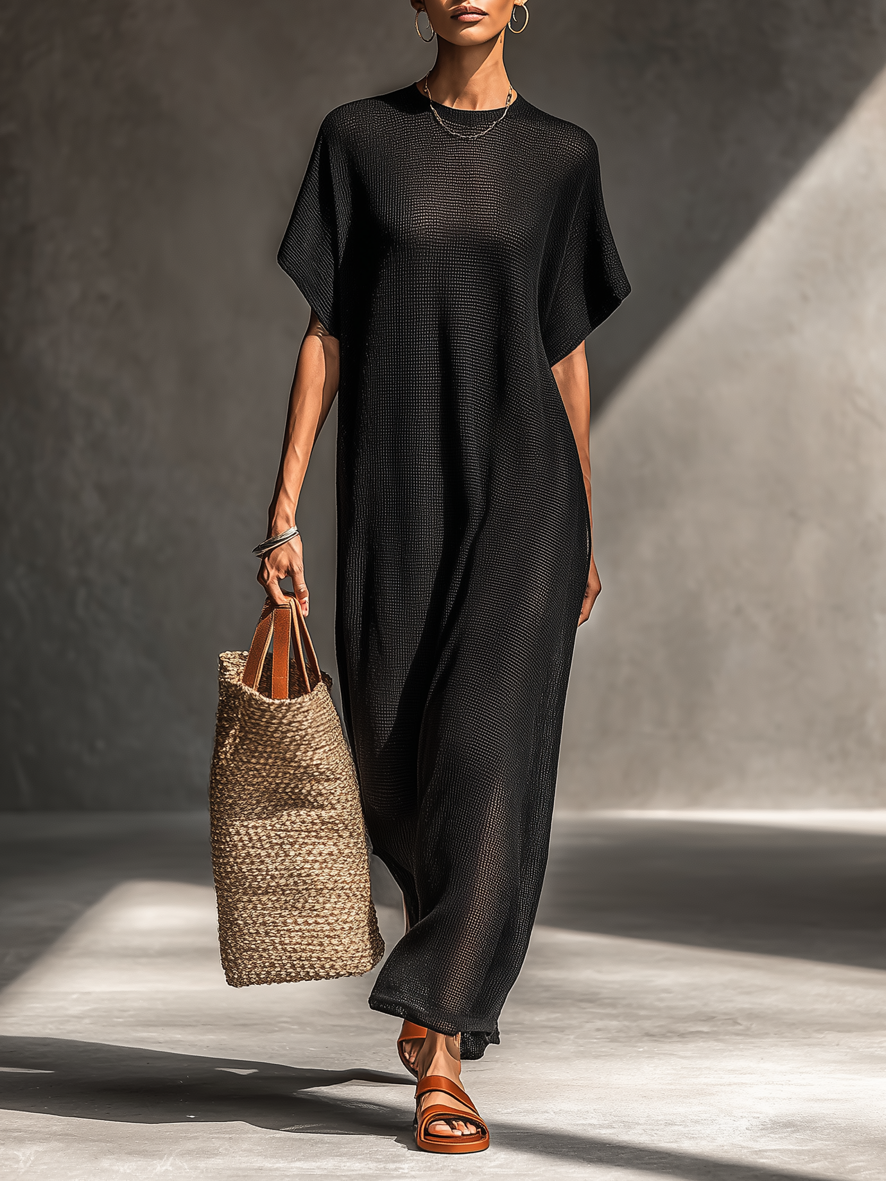Women's Minimalist Sheer Knit Short-sleeved Maxi Dress MDZ0911A8Y