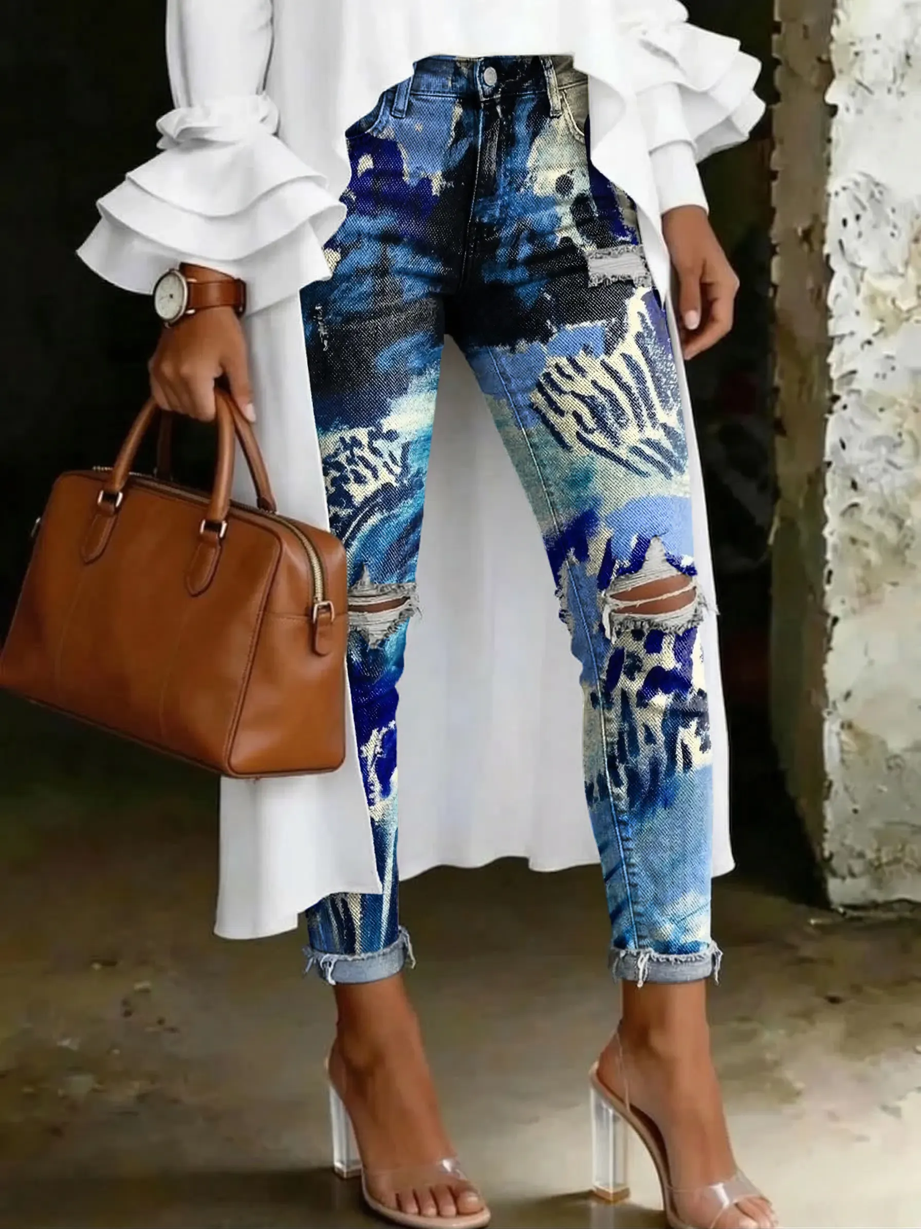 Abstract Graffiti Print Art-printed Casual Skinny Ripped Jeans