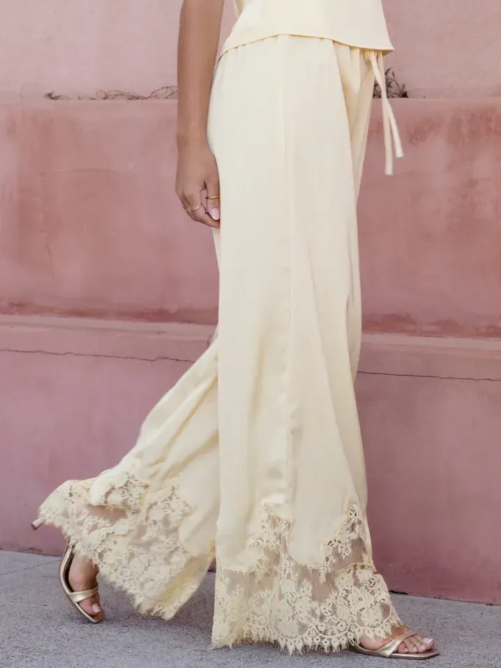 Casual Solid-color Elastic-waist Lace-panel Wide-leg Pants