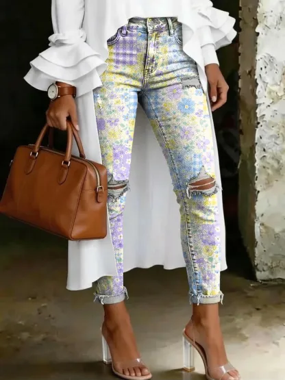 Checkered Floral Artistic Print Distressed Skinny Jeans