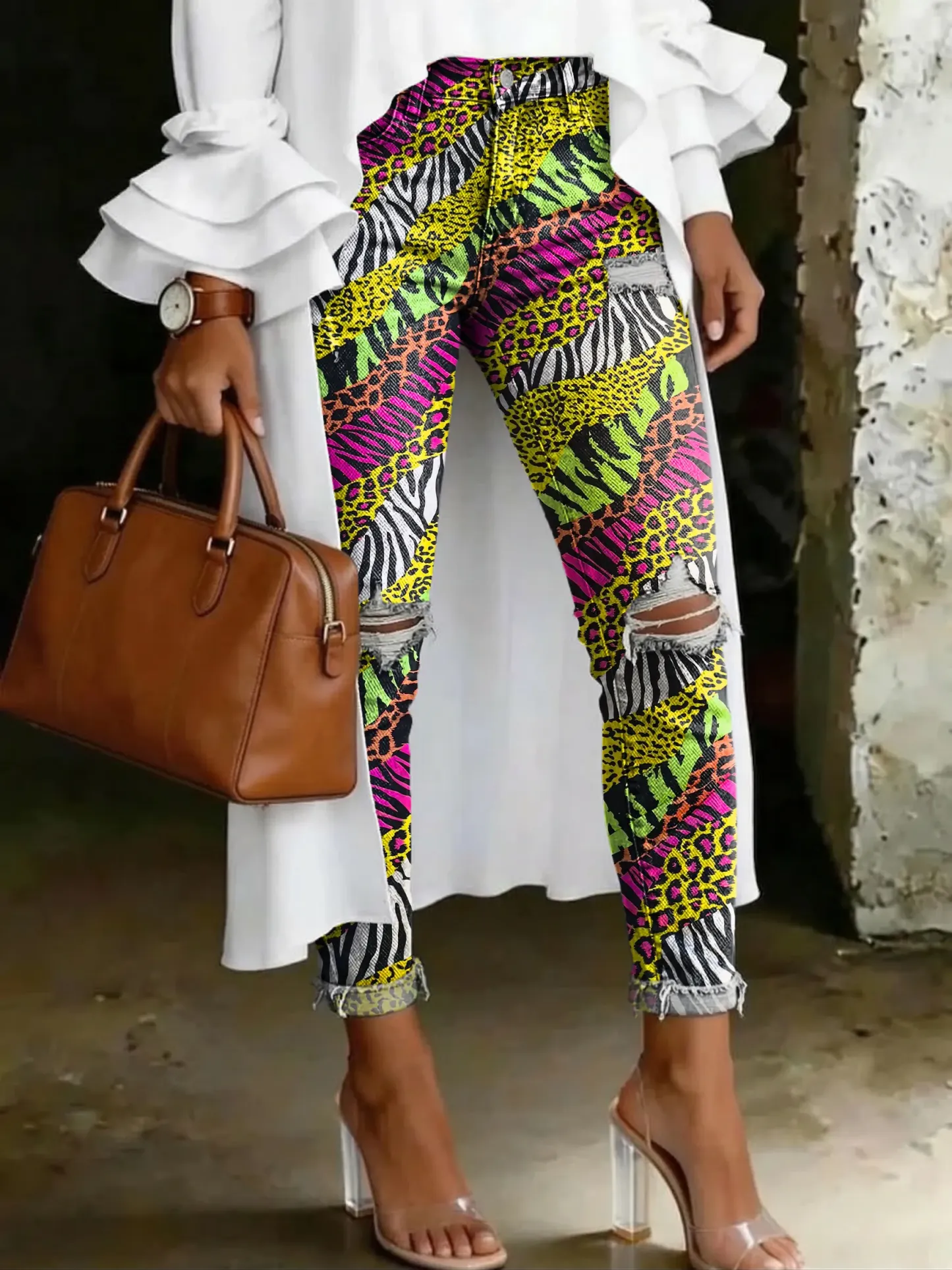 Contrasting Leopard And Zebra Prints Artistic Print Ripped Casual Skinny Jeans