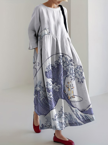 Cozy Cat Surfing Of The Great Waves Linen Blend Casual Maxi Dress