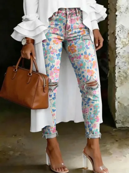 Cute Floral Print Artistic Print Casual Skinny Ripped Jeans