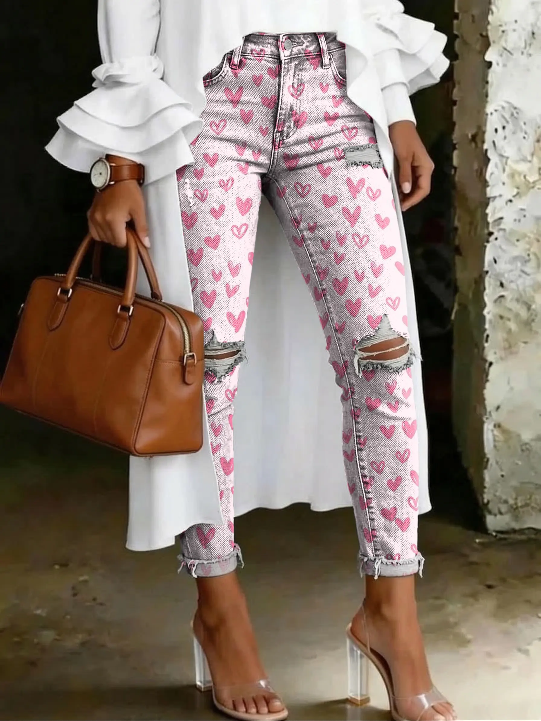 Cute Pink Hearts Artistic Print Distressed Skinny Jeans