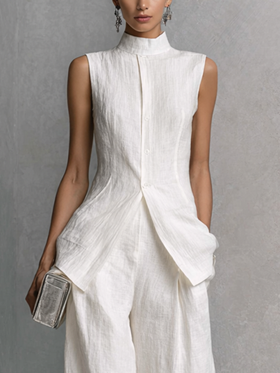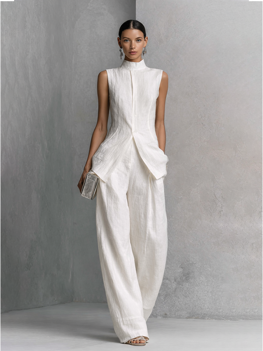 This elegant set is made from lightweight and breathable white crinkled fabric and includes a stand-collar sleeveless shirt and high-waisted wide-leg pants. The shirt's stand collar and high-low hem design, combined with the pants' loose silhouette, perfectly showcase a woman's fashion and sophistication. Shell buttons add a touch of refinement, making it suitable for stylish commuting or casual vacation looks.