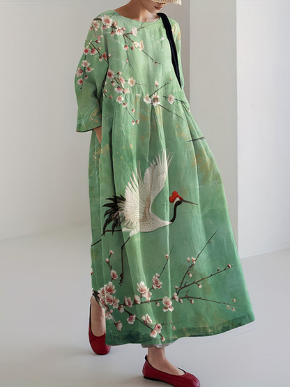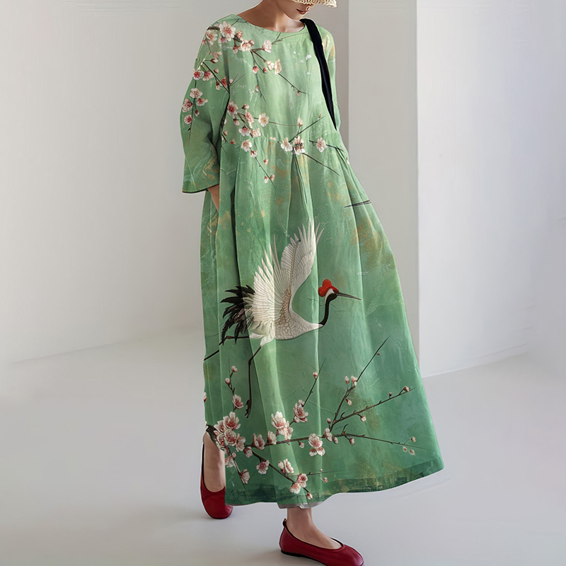 Flowers and Birds Printed Loose Midi Dress