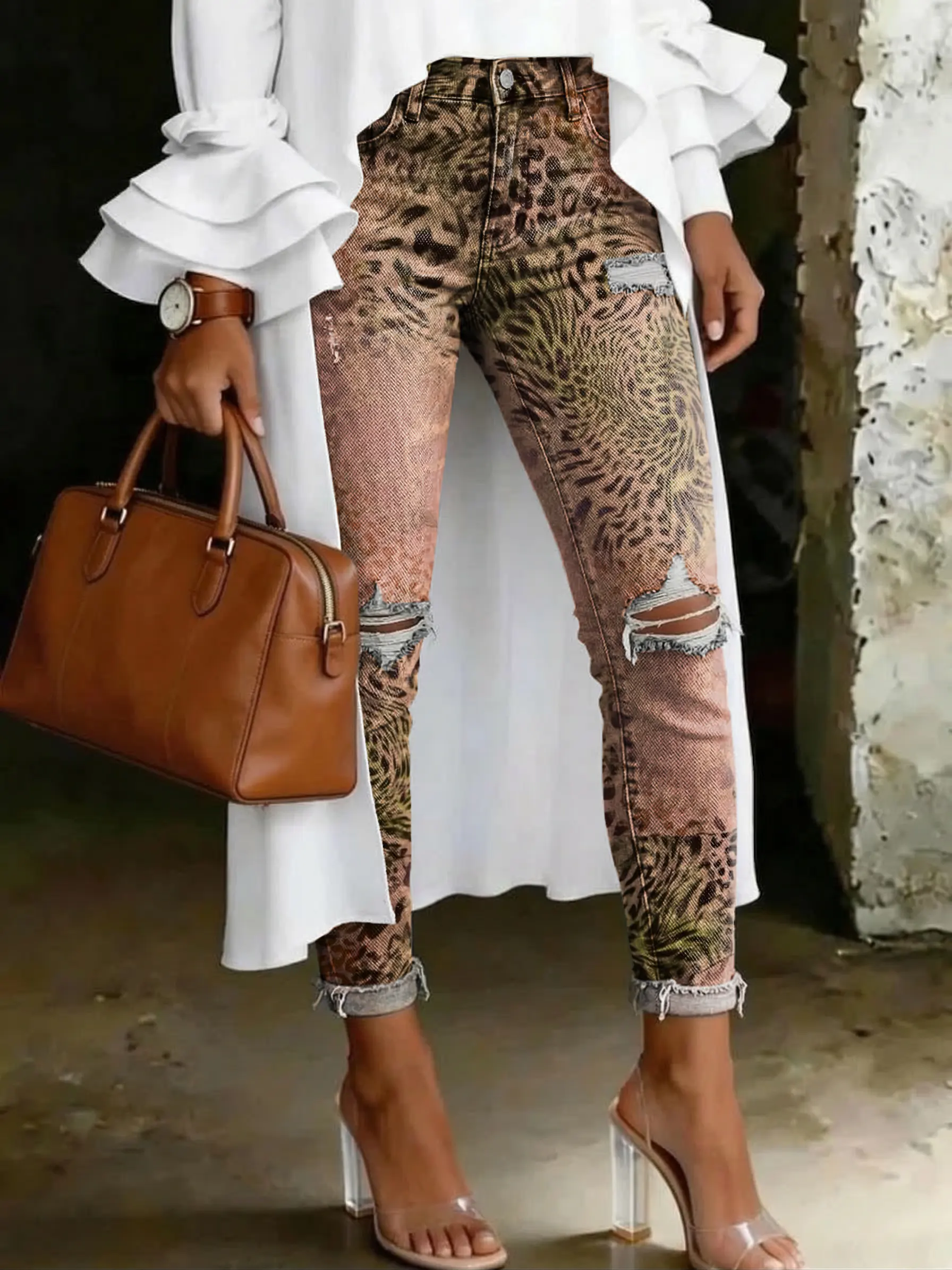 Gradient Abstract Leopard Print Artistic Print High-waisted Casual Ripped Skinny Jeans