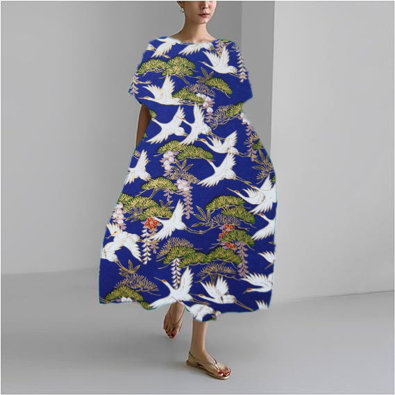 Japanese Chiyogami White and Gold Cranes on Blue Art Linen Blend Maxi Dress