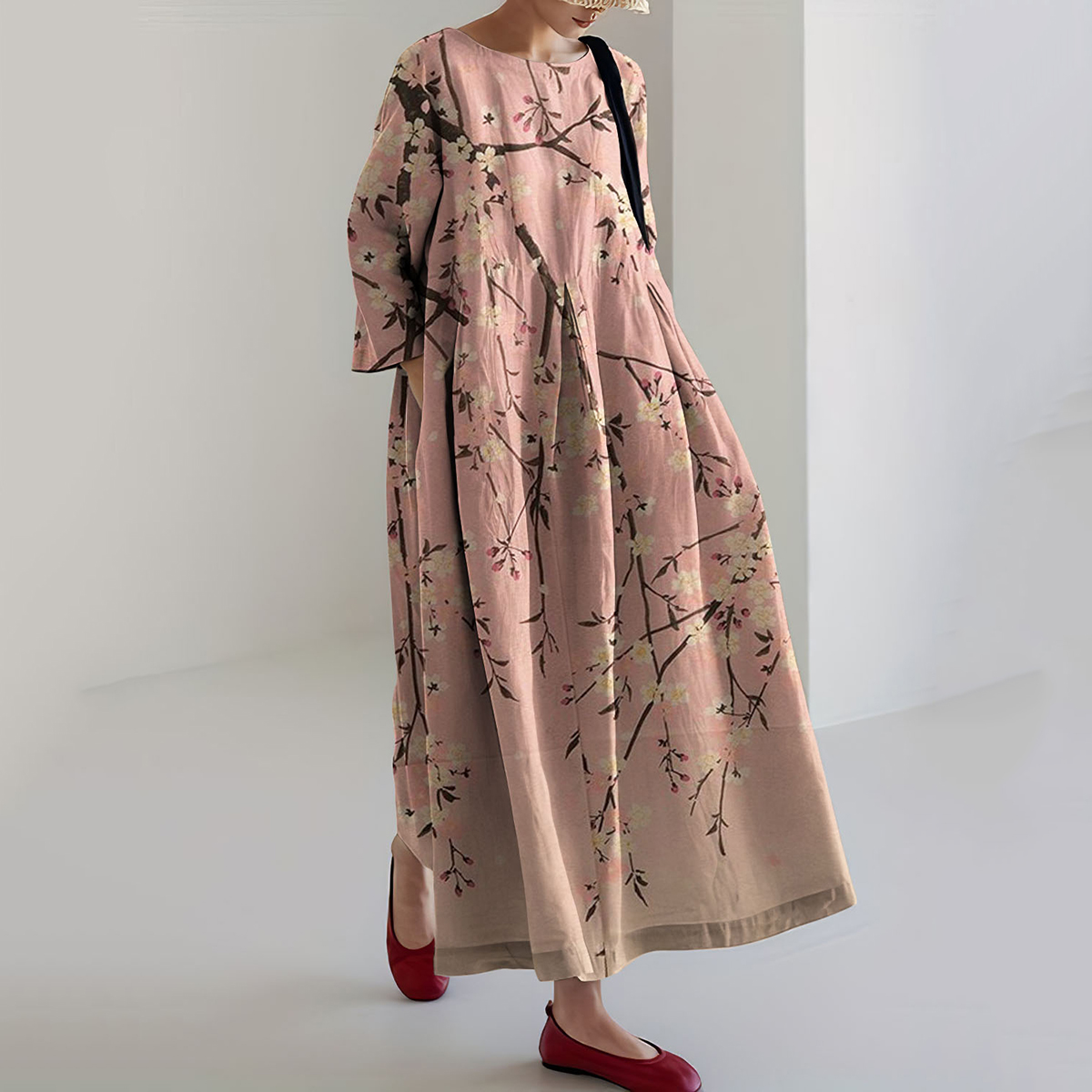 Japanese Plum Blossom Art Linen Blend Maxi Dress