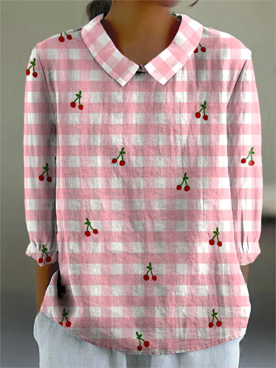 Lovely Summer Cherry And Plaid Pattern Printed Women's Casual Cotton And Linen 3/4 Sleeve Shirt