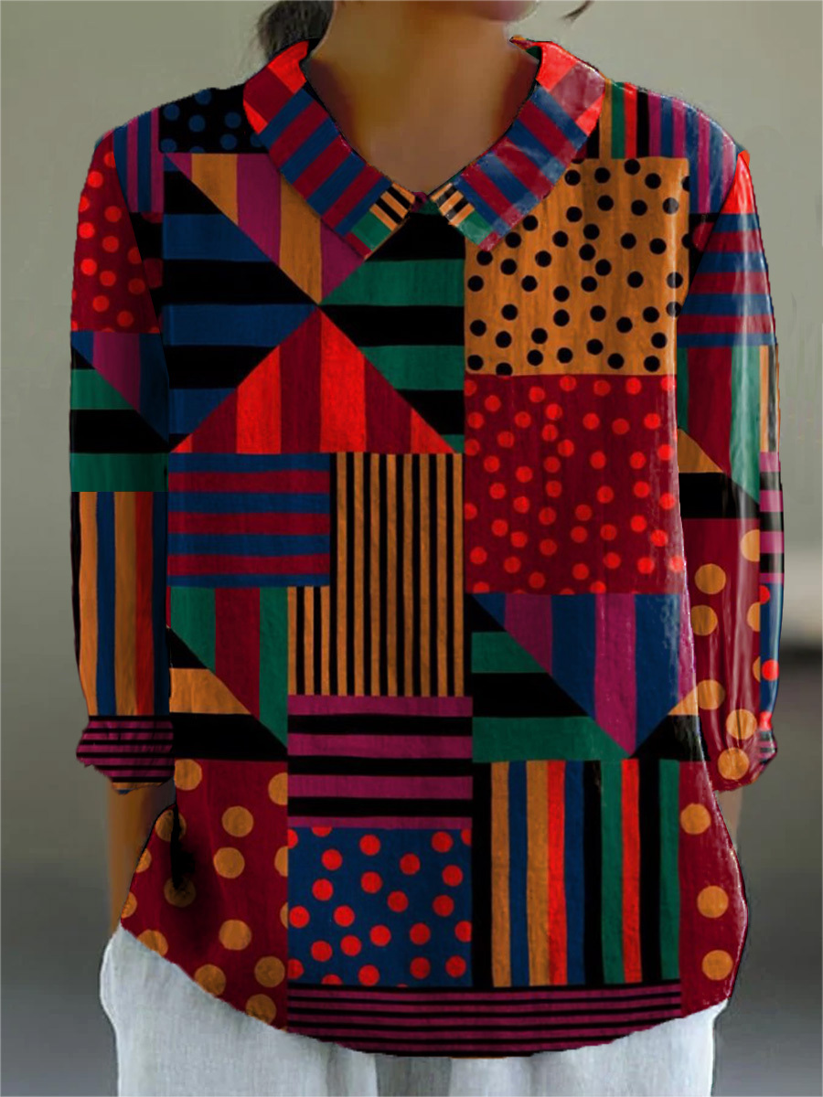 Multicolor Geometric Pattern Printed Women's Casual Cotton And Linen 3/4 Sleeve Shirt