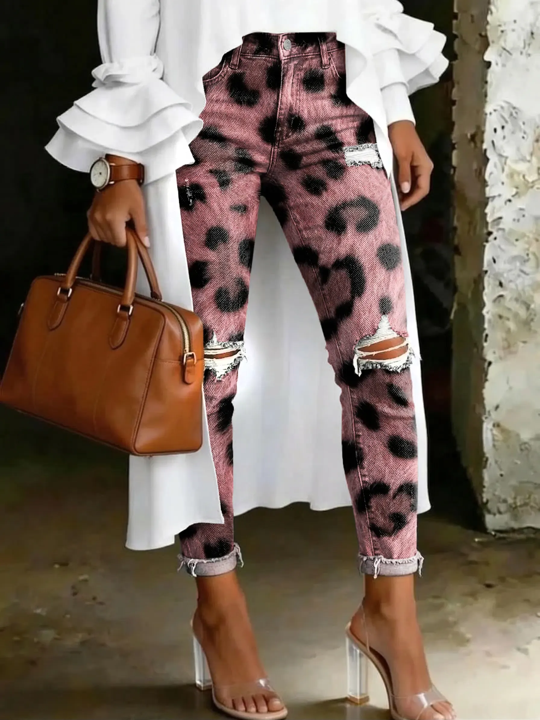 Pink Heart-print Leopard-print Artistic-print Casual High-waisted Skinny Ripped Jeans